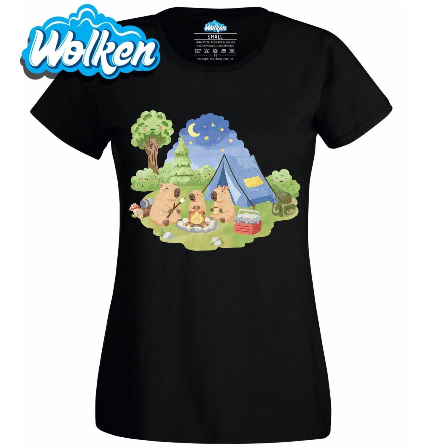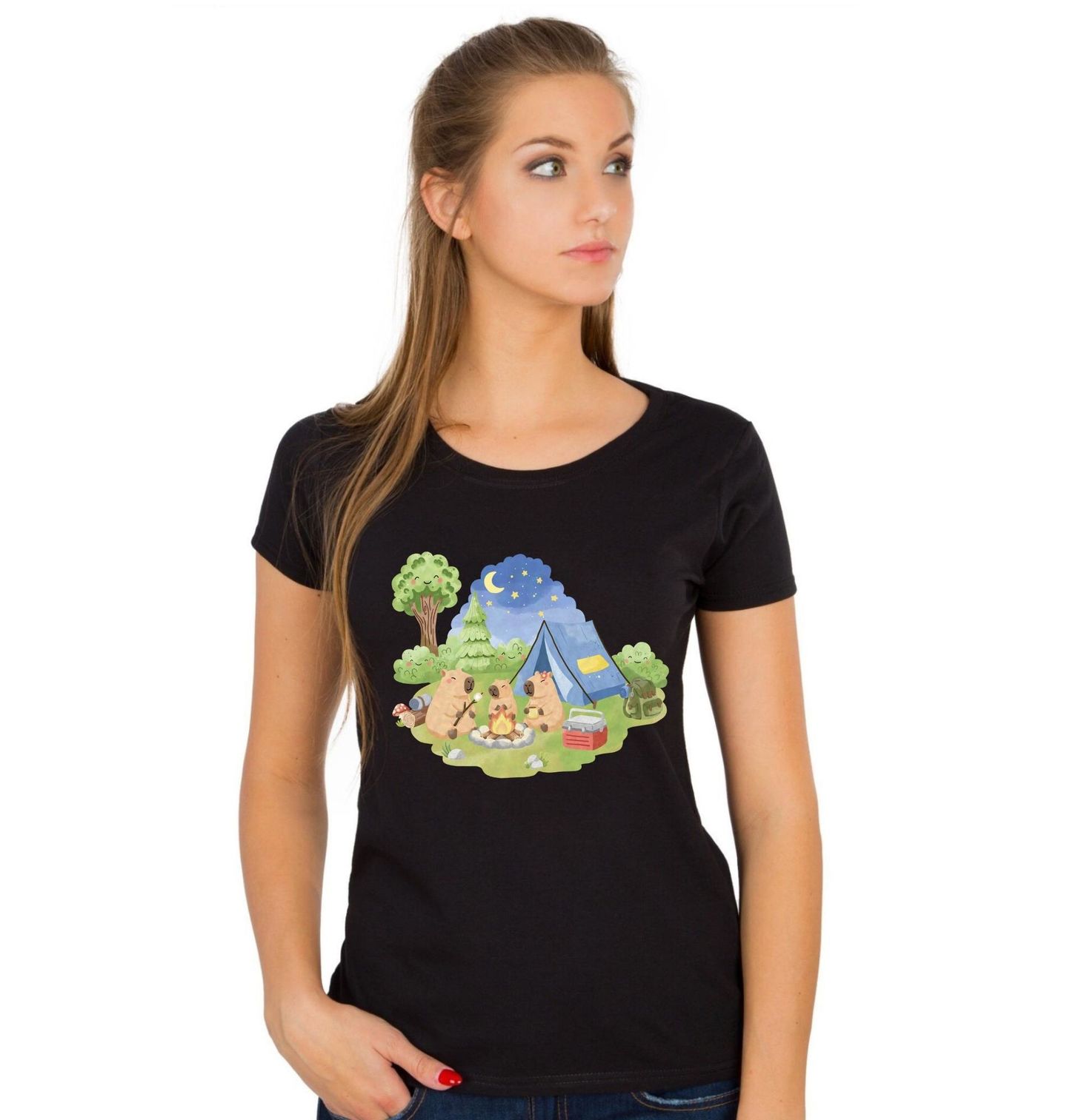 Dámské tričko Kapybaří Rodina u Táboráku. Tento roztomilý motiv zachycuje tři kapybary, jak si užívají večerní táboření pod hvězdami. Hlodavec kapybara, známý svou přátelskou povahou, je zde vyobrazen v rodinné pohodě – u ohně, s hrnkem kakaa a opékaným marshmallow. Ideální pro milovníky přírody, kempování a zvířecích motivů!