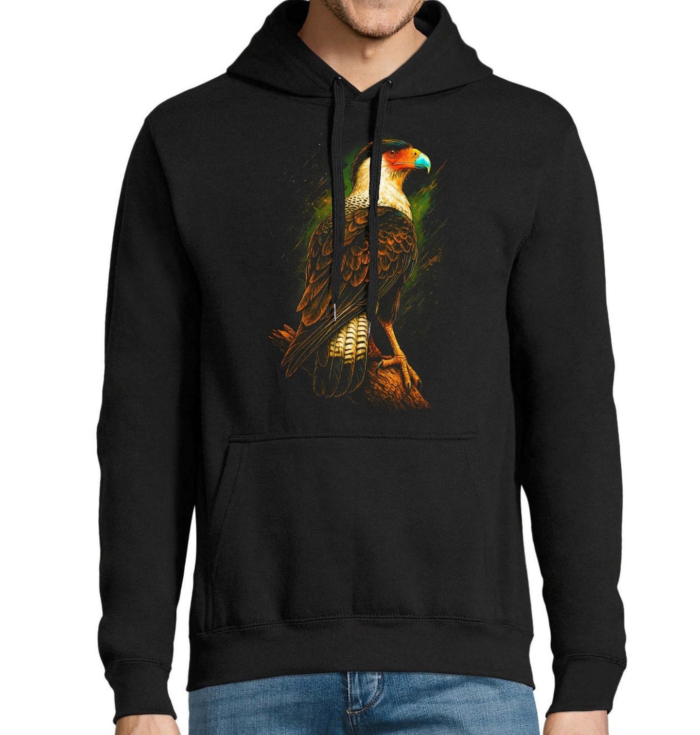 Pánská mikina Karančo jižní. Majestátní pták karančo jižní (Caracara plancus), známý také jako karakara chocholatá. Tento dravec patří do čeledi sokolovitých a obývá otevřené krajiny Jižní Ameriky. Pták karančo jižní je symbolem síly, vytrvalosti a přirozené dominance.