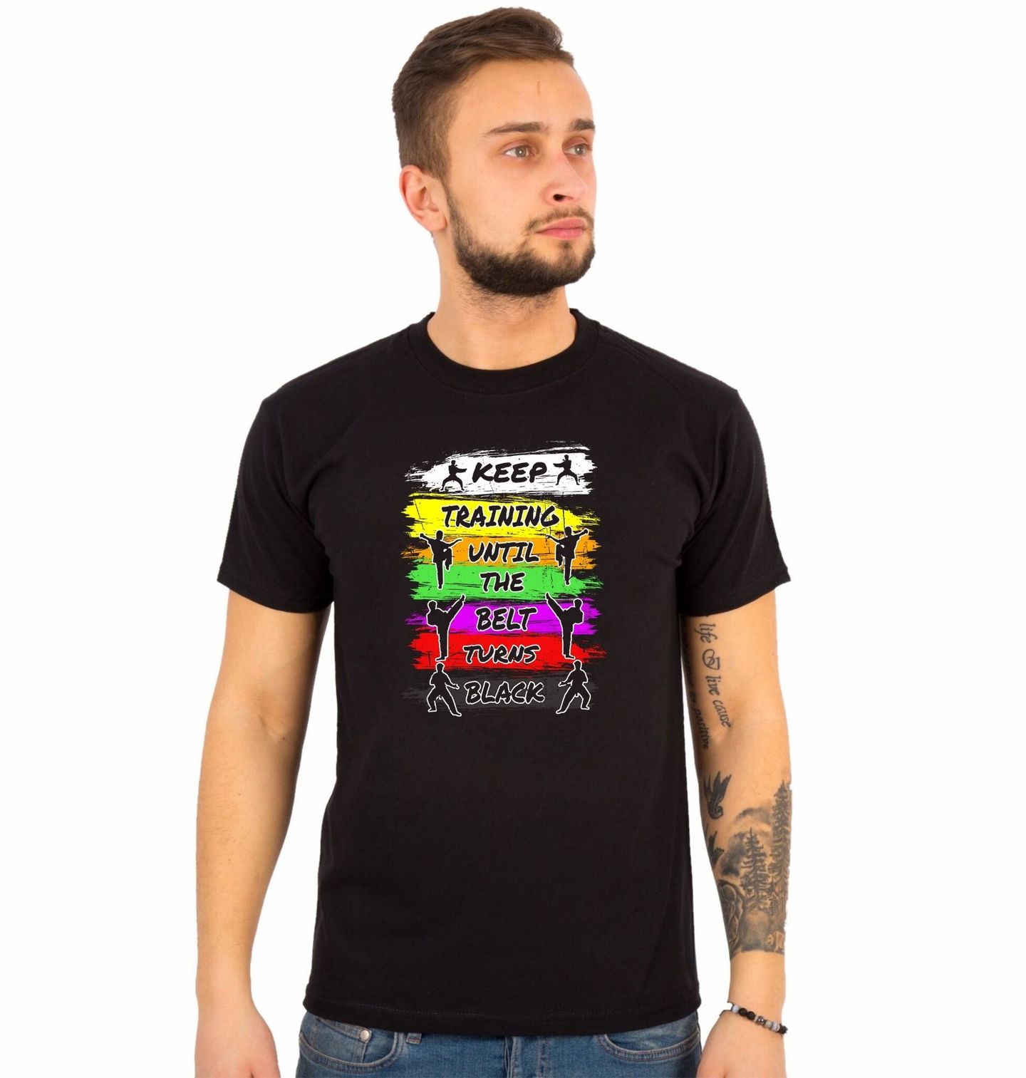 Pánské tričko Karate – Trénuj, dokud pásek nezčerná. Motivační design pro všechny, kteří milují karate a nevzdávají se svých cílů. Na motivu je anglický nápis „KEEP TRAINING UNTIL THE BELT TURNS BLACK“. Barevné pruhy symbolizují postupné stupně pásků a siluety karatistů dodávají motivu energii, dynamiku a odhodlání.