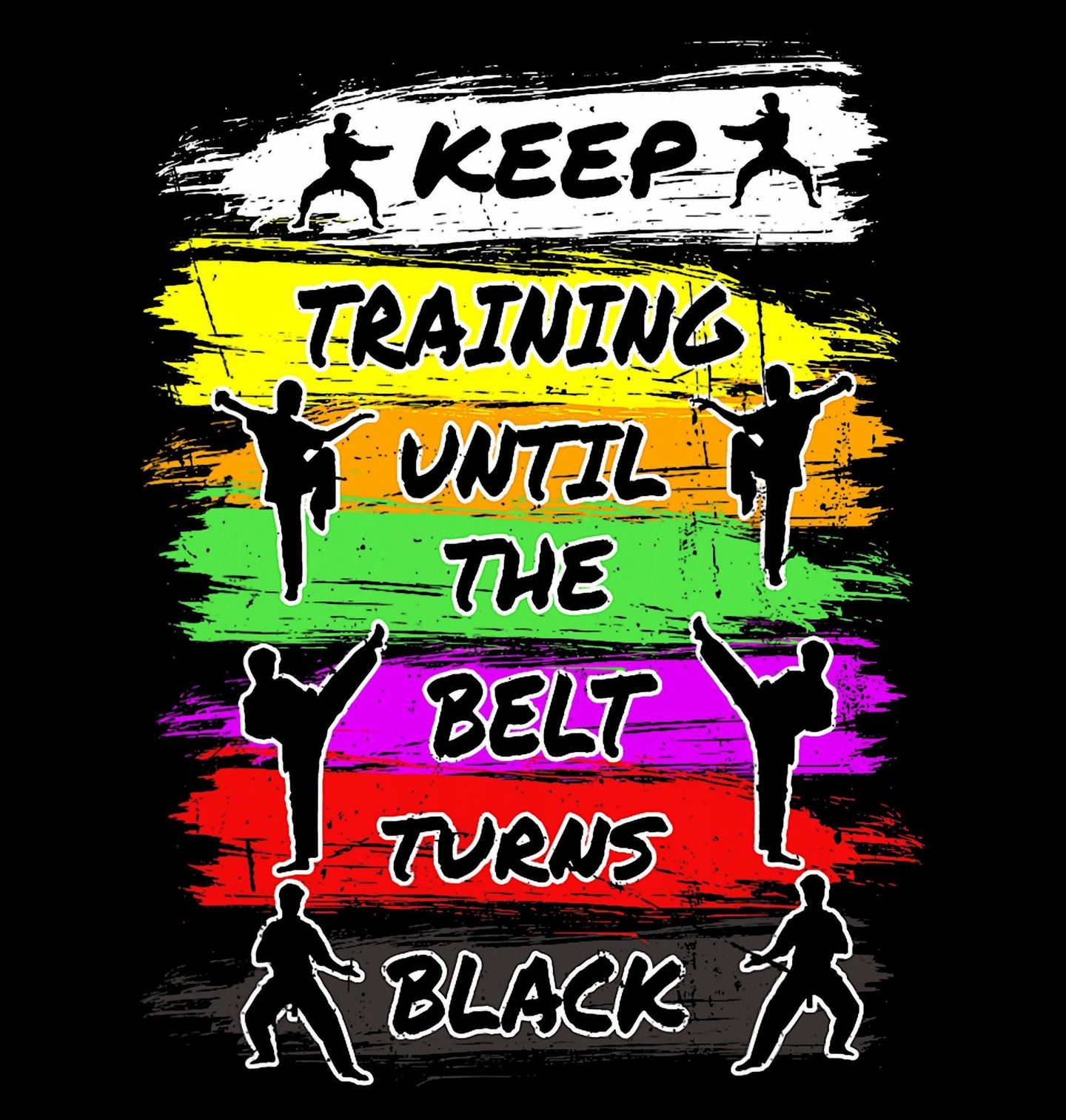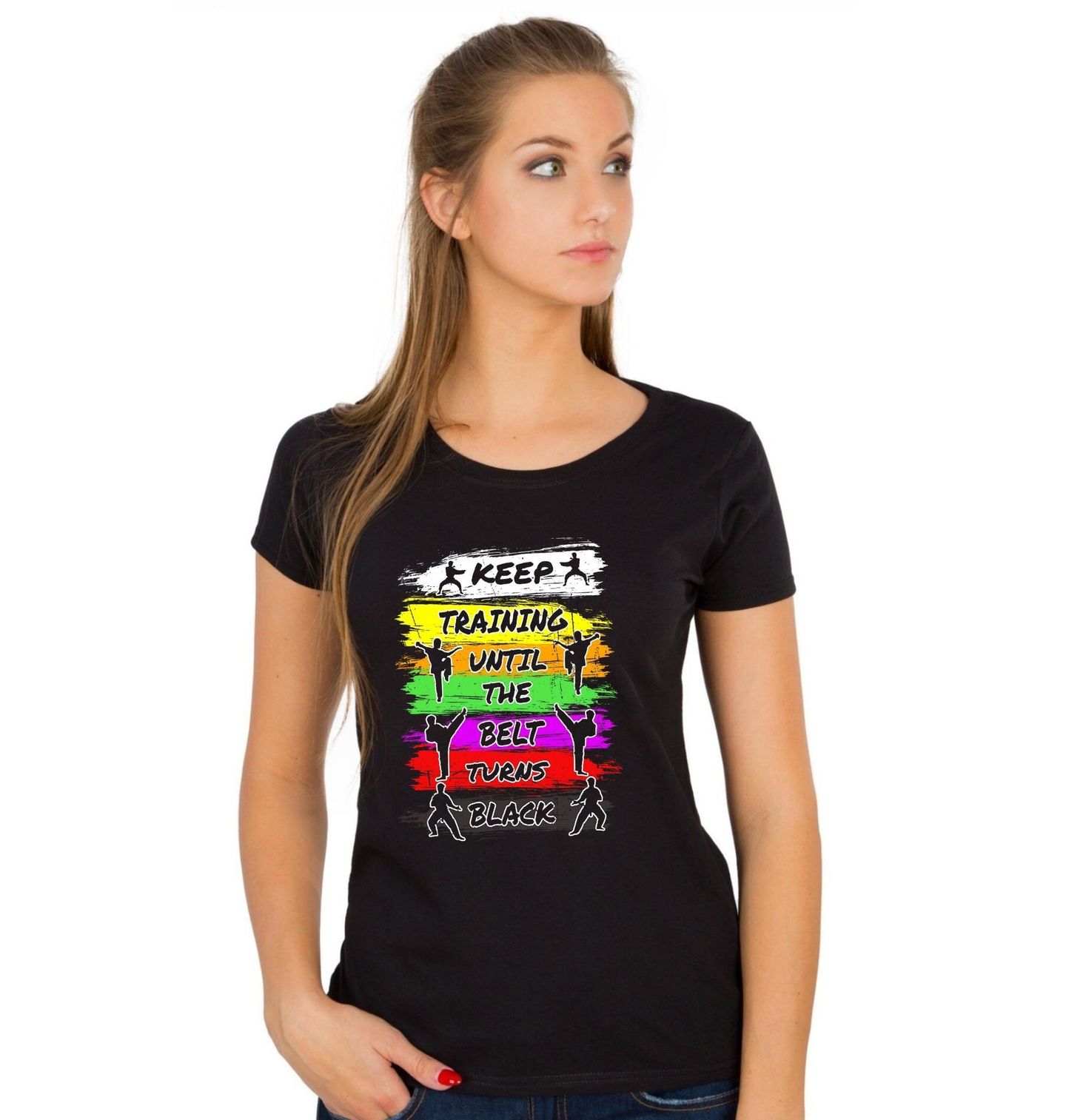 Dámské tričko Karate – Trénuj, dokud pásek nezčerná. Motivační design pro všechny, kteří milují karate a nevzdávají se svých cílů. Na motivu je anglický nápis „KEEP TRAINING UNTIL THE BELT TURNS BLACK“. Barevné pruhy symbolizují postupné stupně pásků a siluety karatistů dodávají motivu energii, dynamiku a odhodlání.
