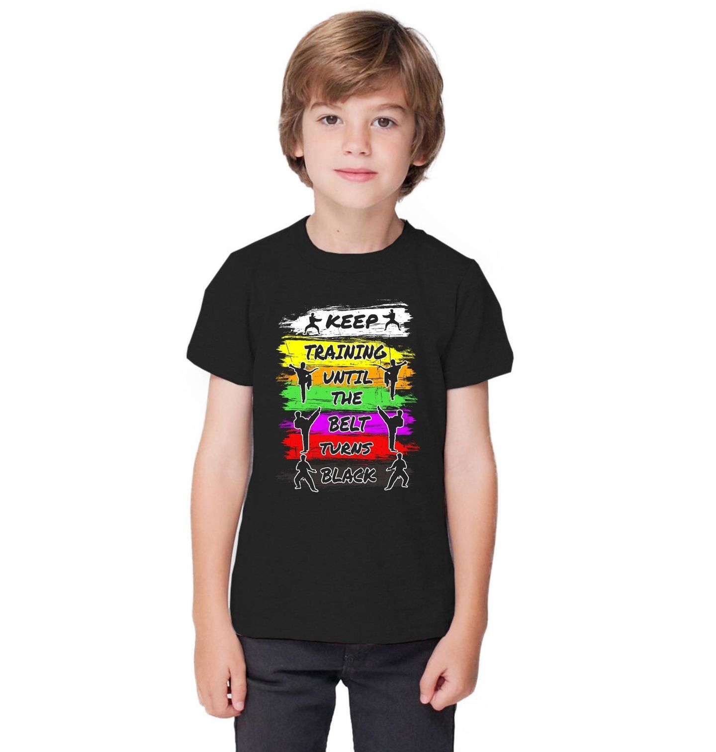 Dětské tričko Karate – Trénuj, dokud pásek nezčerná. Motivační design pro všechny, kteří milují karate a nevzdávají se svých cílů. Na motivu je anglický nápis „KEEP TRAINING UNTIL THE BELT TURNS BLACK“. Barevné pruhy symbolizují postupné stupně pásků a siluety karatistů dodávají motivu energii, dynamiku a odhodlání.