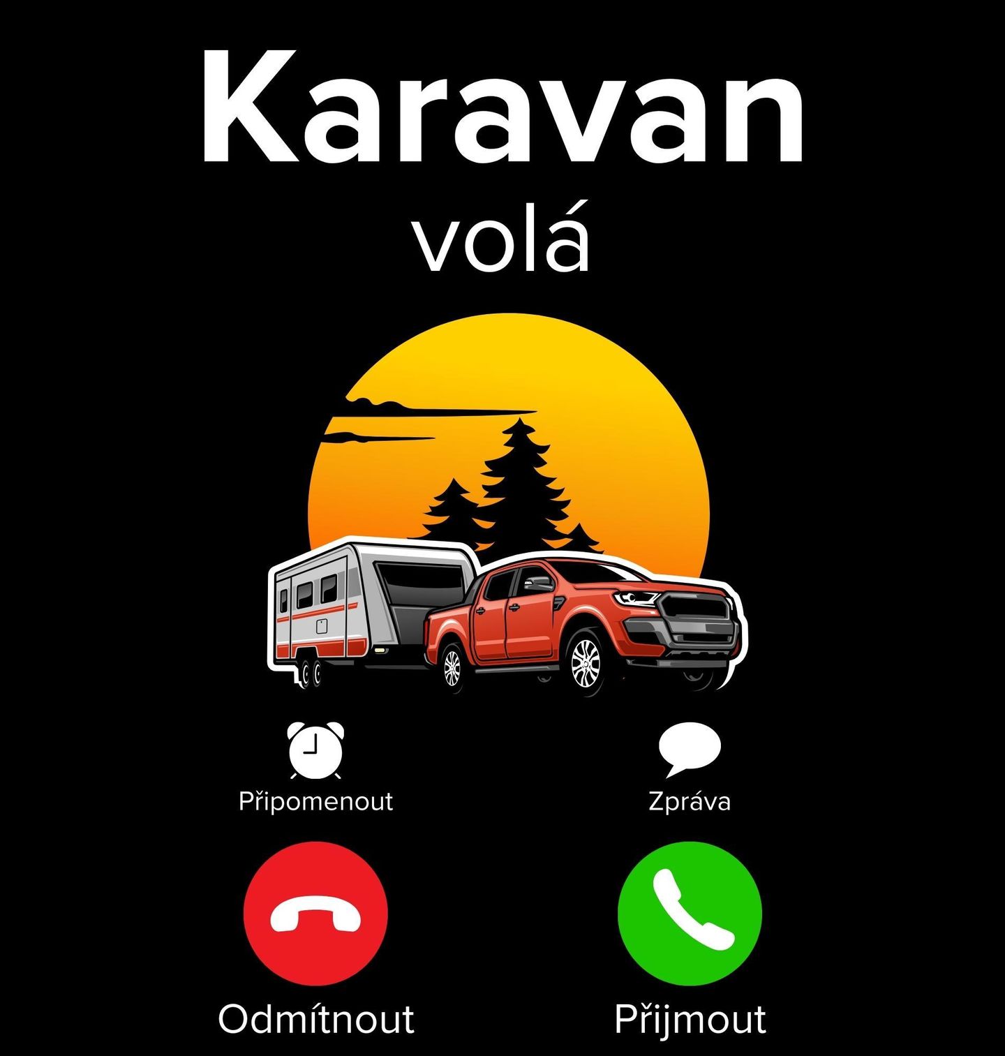Dětské tričko Karavan volá Phone Call. Originální motiv pro všechny, kteří milují svobodu, přírodu a nekonečné cestování. Stylová grafika s autem a přívěsem připomíná příchozí hovor a jasně říká, že karavan už čeká na další výpravu. Tento motiv spojuje humor i vášeň pro cestování a je perfektní volbou pro milovníky roadtripů, kempování i dlouhých dovolených.