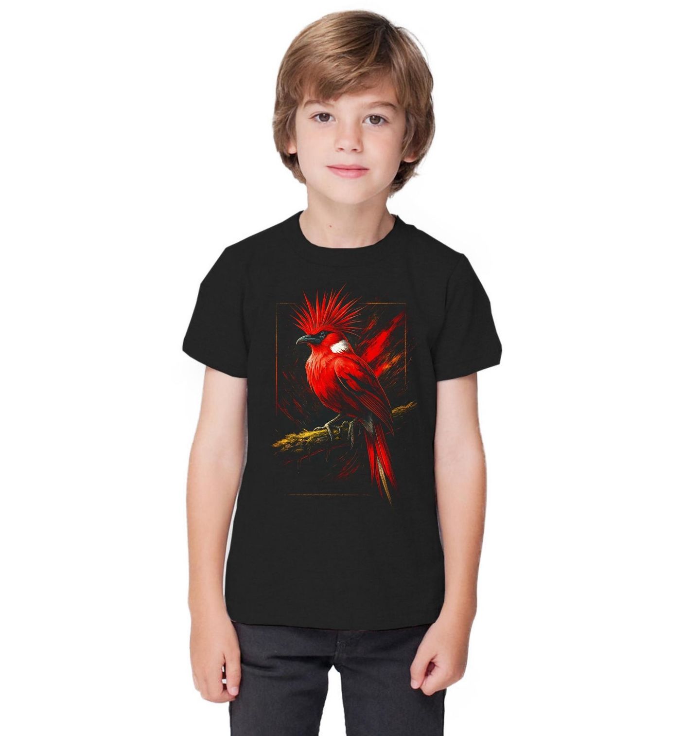Dětské tričko Kardinál červený. Kardinál chocholatý je ikonický severoamerický pták, známý svou teritoriální povahou, výrazným hlasem a celoživotní věrností partnerovi. Dominantním prvkem je ostrá, vztyčená chocholka a sytě červené zbarvení, které symbolizuje vášeň, sílu a nezkrotnou energii.