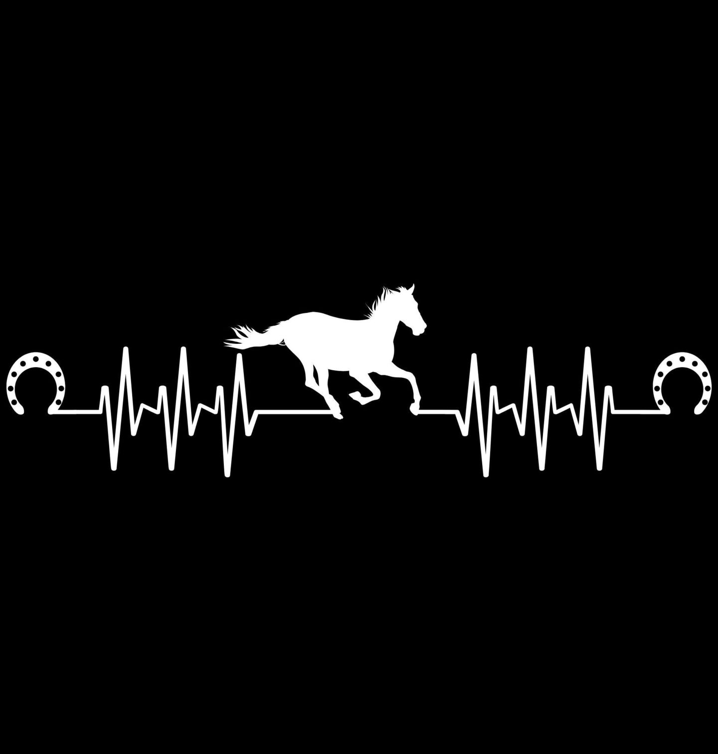 Dětské tričko Kardiogram a Běžící Kůň. Uprostřed motivu je silueta běžícího koně, kterou obklopuje linie připomínající kardiogram, doplněná o stylové podkovy na obou koncích. Kůň je symbolem volnosti a energie, podkova přináší štěstí a kardiogram vyjadřuje tep vášně ke zvířatům i jezdectví.