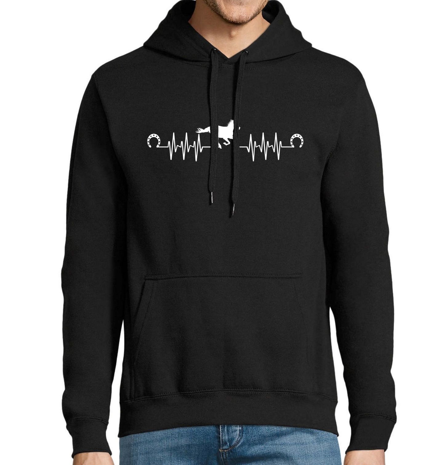 Pánská mikina Kardiogram a Běžící Kůň. Uprostřed motivu je silueta běžícího koně, kterou obklopuje linie připomínající kardiogram, doplněná o stylové podkovy na obou koncích. Kůň je symbolem volnosti a energie, podkova přináší štěstí a kardiogram vyjadřuje tep vášně ke zvířatům i jezdectví.