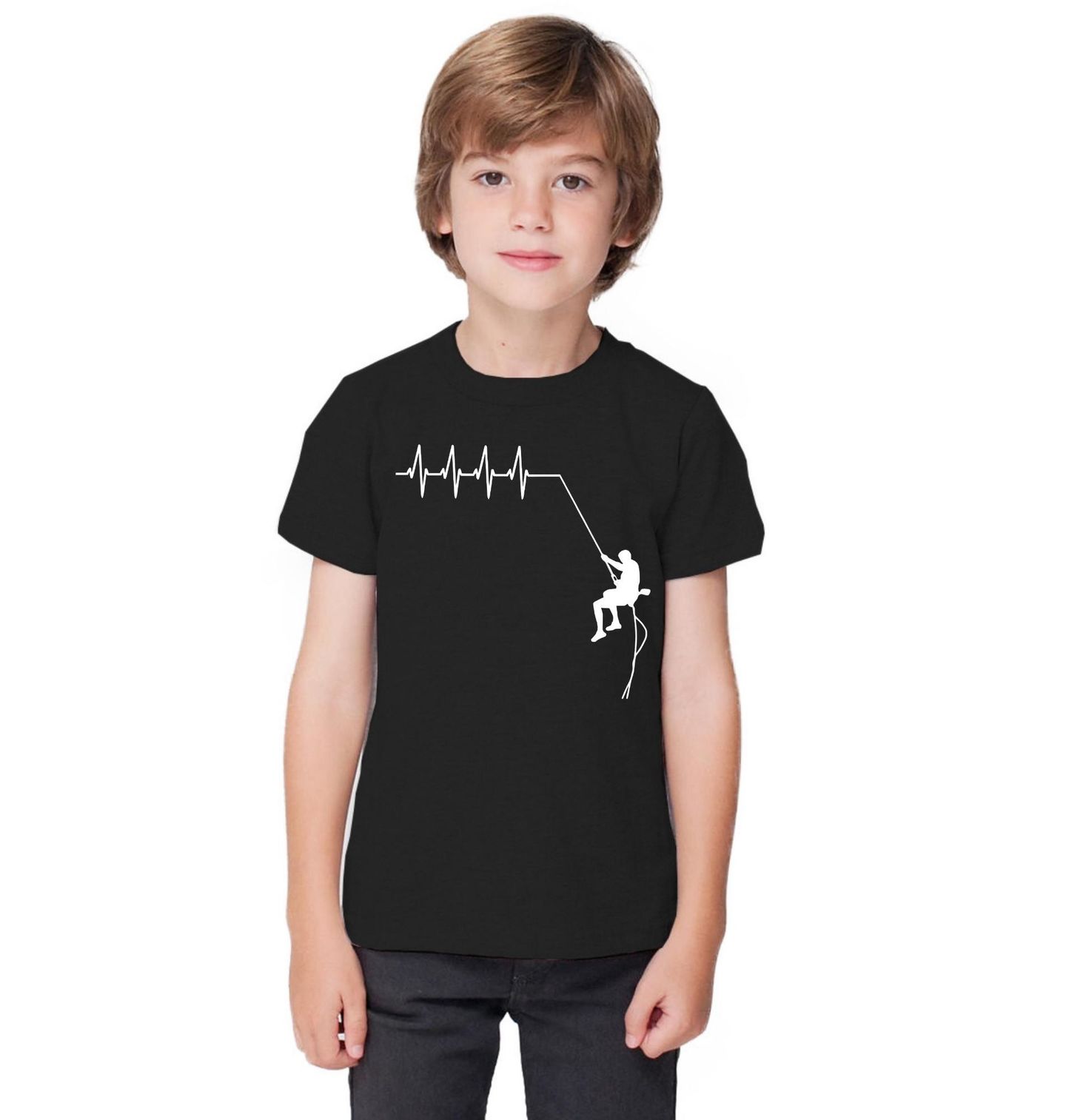 Dětské tričko Kardiogram a Horolezec. Tento potisk znázorňuje kmitající srdeční tep, který plynule přechází v lano s horolezcem. Motiv dokonale vystihuje adrenalin a radost, kterou každý lezec cítí při každém výstupu. Je to ideální kousek pro každého, komu hory a skály rozbuší srdce. Oblečte si tento originální design a ukažte, co je váš životní styl.