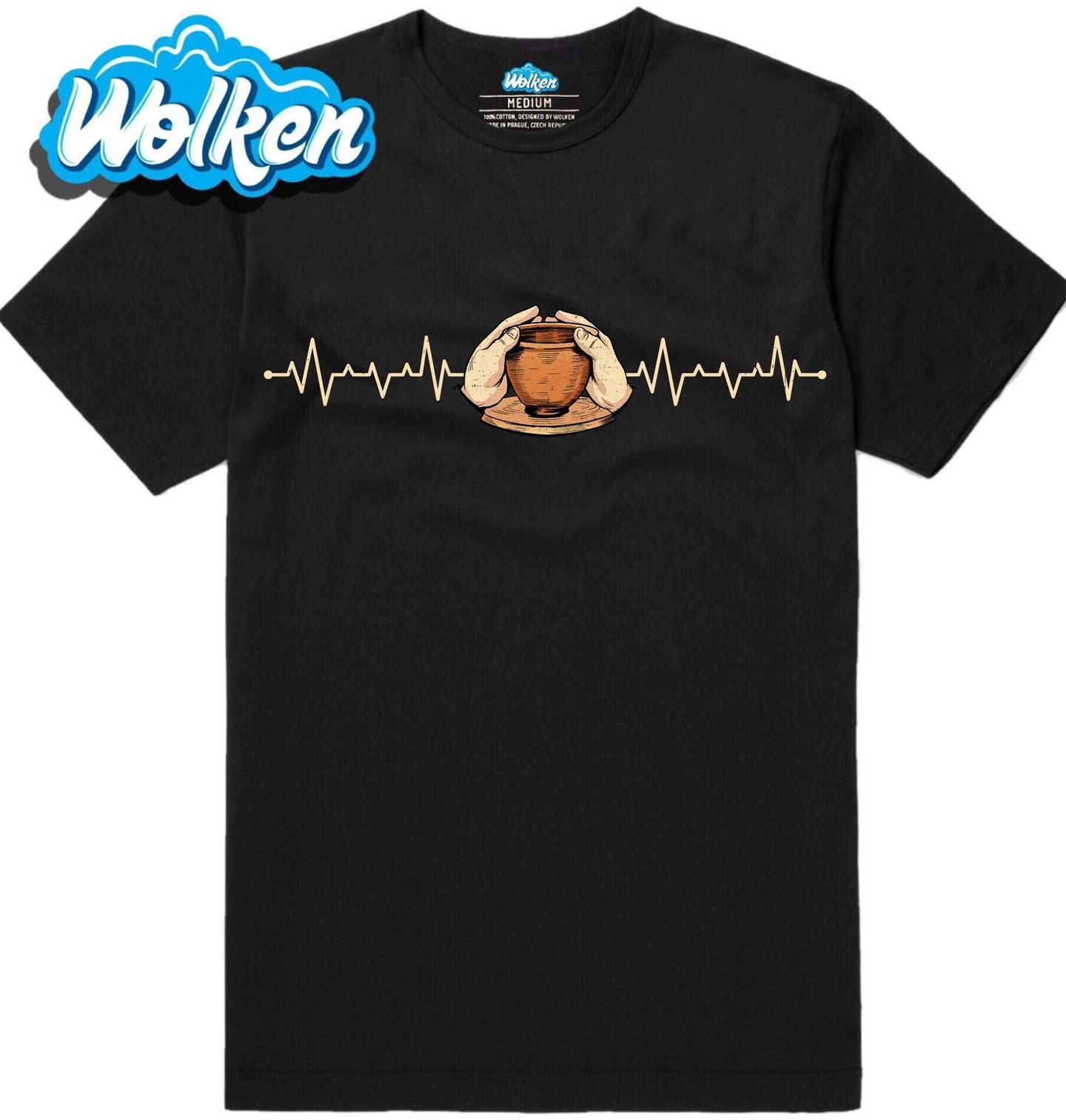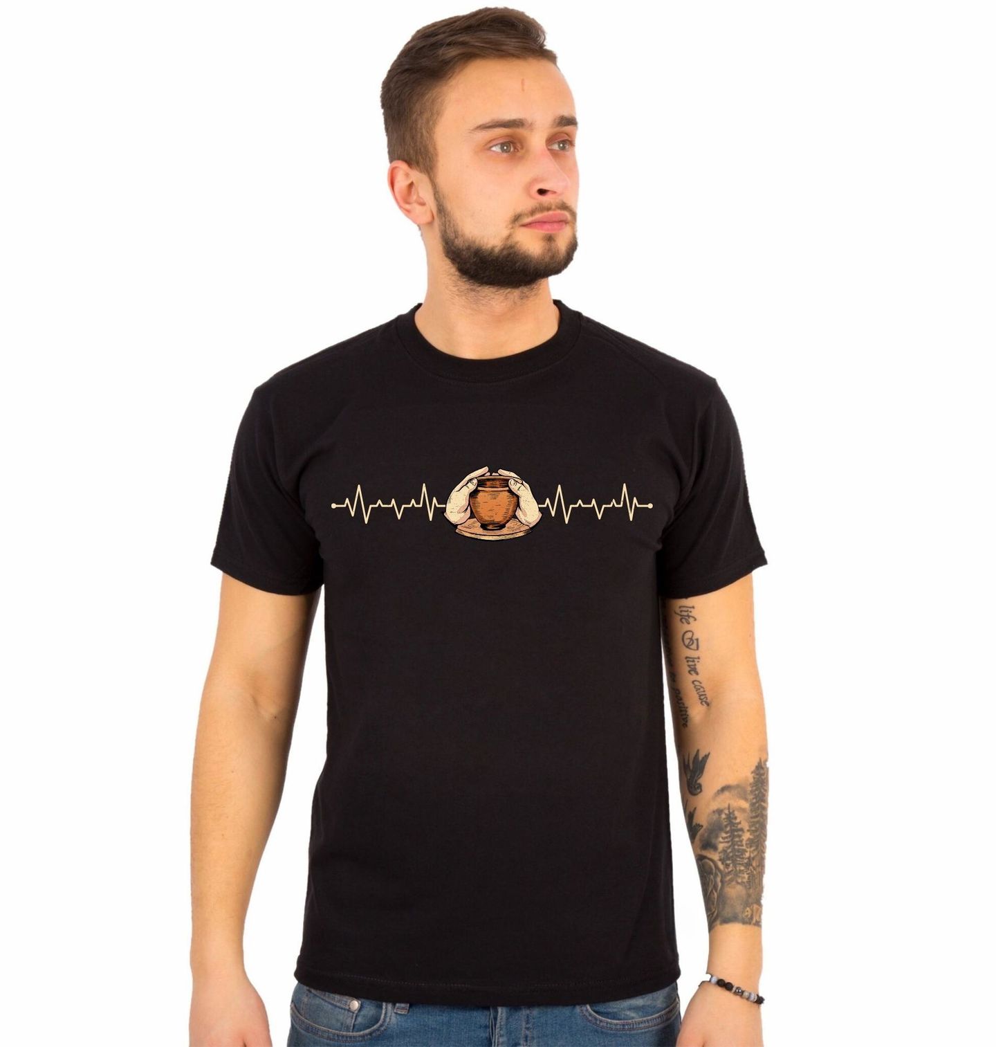 Pánské tričko Kardiogram a Keramika. Originální motiv kardiogram propojený s rukama formujícíma keramickou nádobu na hrnčířském kruhu je perfektní volbou pro milovníky řemesla, ruční výroby a tvořivosti. Tento design znázorňuje, že láska k řemeslu je doslova v srdci – každé otočení kruhu bije v rytmu života.