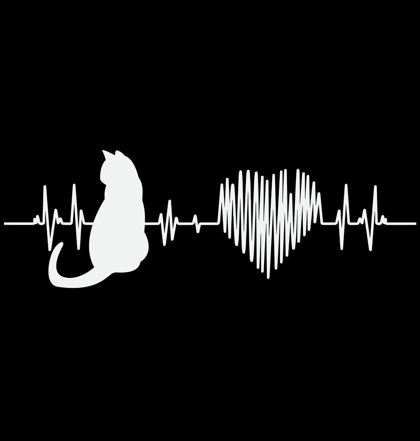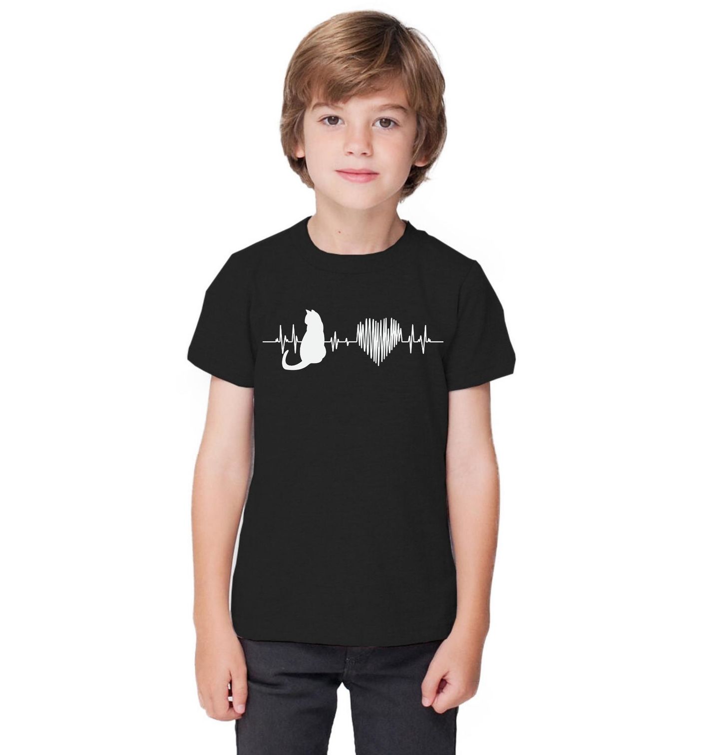 Dětské tričko Kardiogram a Kočičí Srdce. Ilustrace zobrazuje siluetu, kterou je kočka, propojenou s linií srdečního tepu, kde se kardiogram mění v tvar, jaký má srdce. Tento jednoduchý, ale silný vizuál symbolizuje lásku, oddanost a spojení, které kočka přináší do života. Minimalistické provedení dává motivu moderní a čistý vzhled, díky kterému vynikne jeho hlavní myšlenka.