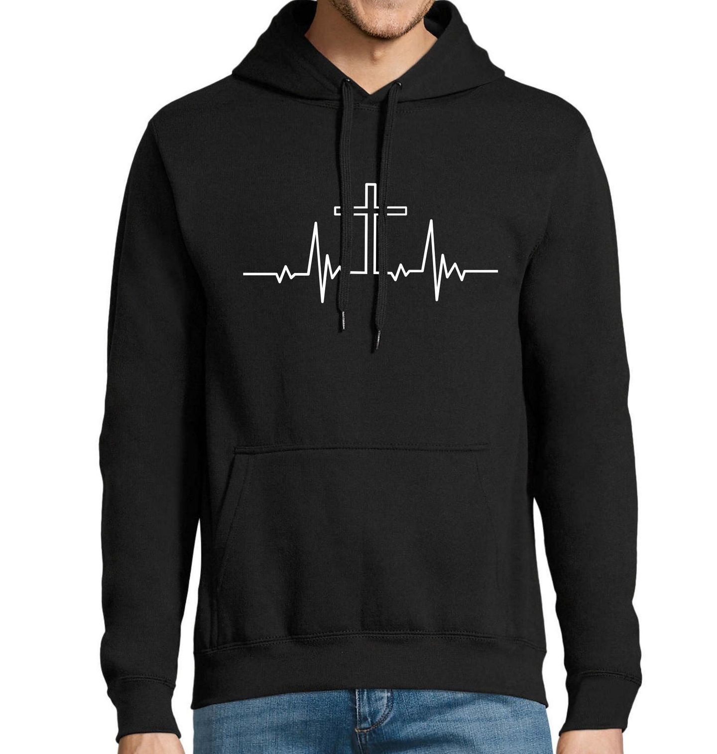 Pánská mikina Kardiogram a Křesťanský Kříž. Výrazný minimalistický motiv propojuje kardiogram se symbolem kříž jako středem duchovní síly. Tepová linie znázorňuje život, zatímco kříž představuje víra, křesťanství a hluboký význam náboženství v každodenním rytmu člověka. Design je určen pro ty, kteří chtějí nenápadně, ale jasně vyjádřit své přesvědčení a vztah k víře.