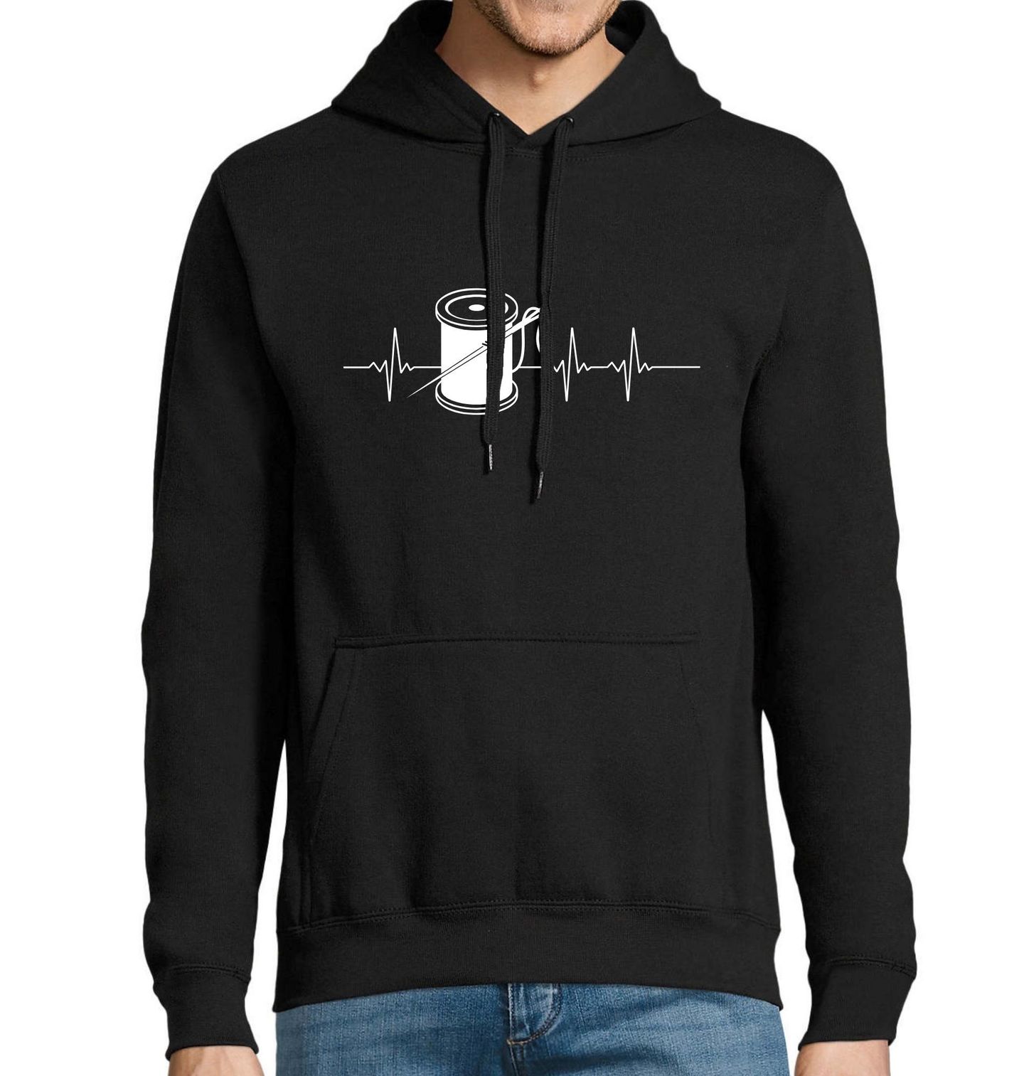Pánská mikina Kardiogram a Nit. Tričko s originálním motivem kardiogramu, jehlou a nití je skvělým dárkem pro každého, kdo miluje šití. Spojuje vizuálně rytmus srdce s vášní pro textilní tvorbu – kardiogram zde symbolizuje životní energii každého, kdo tráví čas se šicím strojem nebo jehlou v ruce.