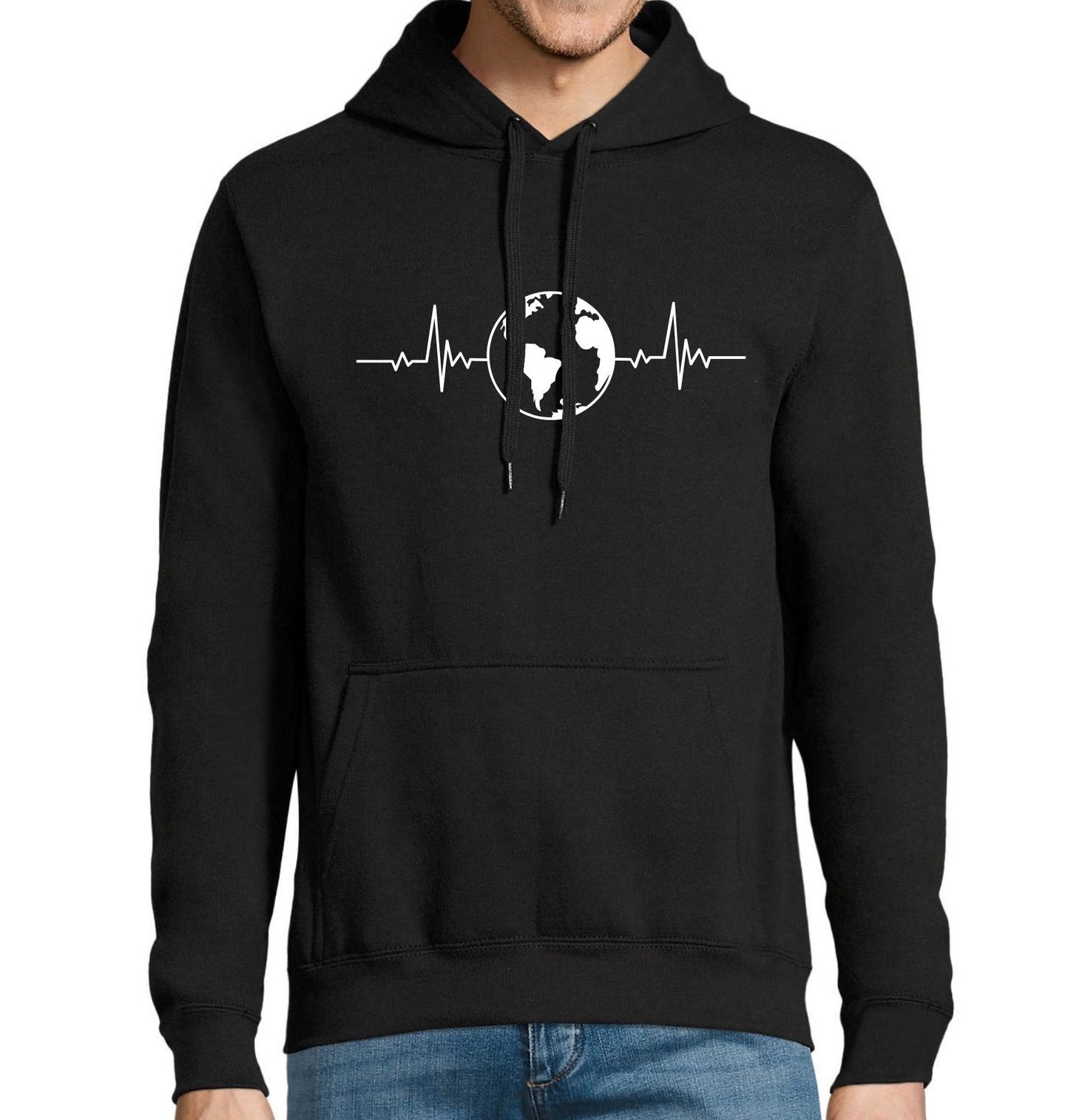 Pánská mikina Kardiogram a Země. Minimalistický motiv propojuje kardiogram se symbolem země jako planety plné života, pohybu a propojení. Srdeční tep po stranách znázorňuje rytmus světa, zatímco zeměkoule uprostřed připomíná, že celá planeta má svůj vlastní puls. Design osloví cestovatele, milovníky přírody i ty, kteří vnímají svět jako jeden živý celek.