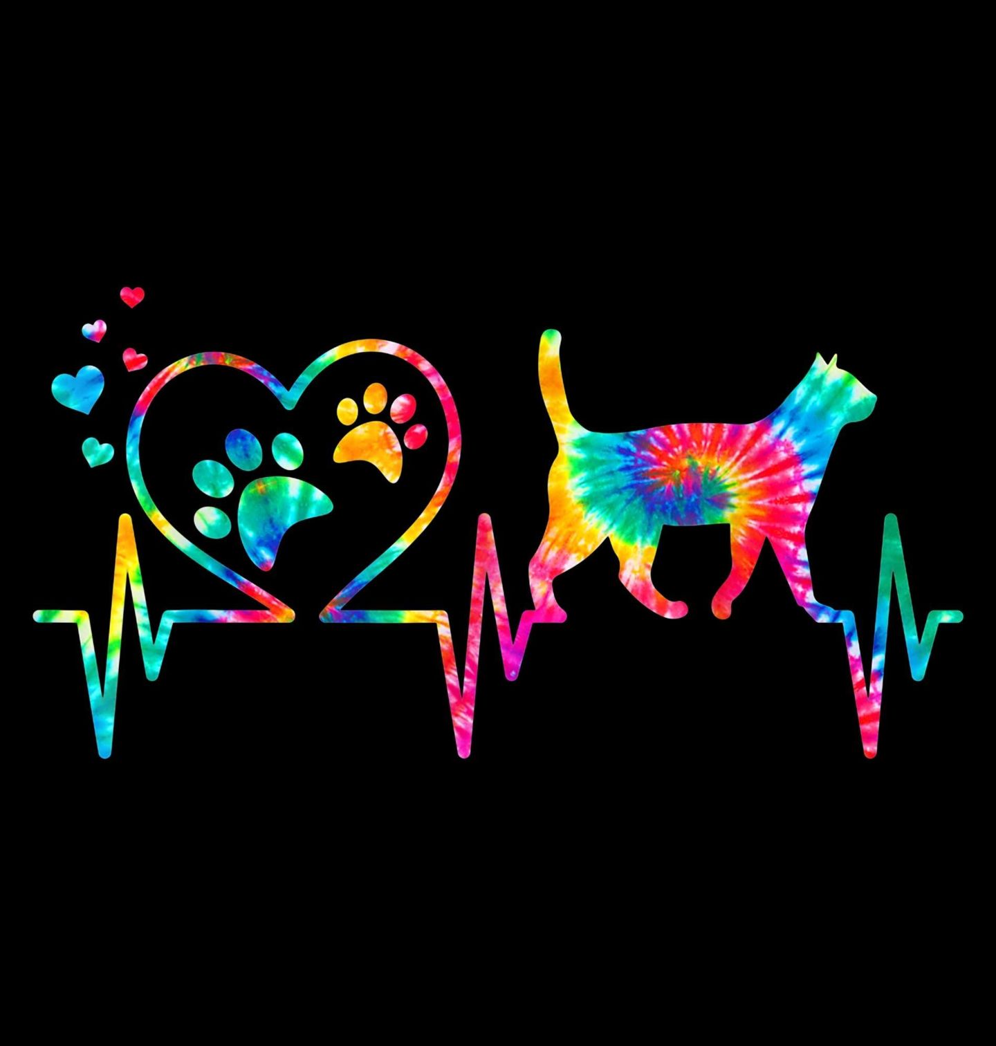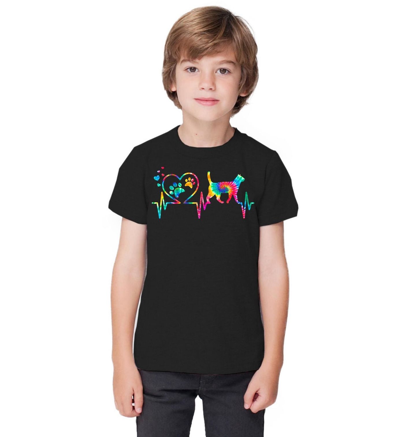 Dětské tričko Kardiogram Lásky a Duhová Kočka. Stylová ilustrace spojuje motiv srdce a kočku s barevným efektem do jedné tepové linie. Symbolika vyjadřuje lásku ke kočkám a jejich místo v našem životě. Ideální design pro všechny milovníky domácích mazlíčků.