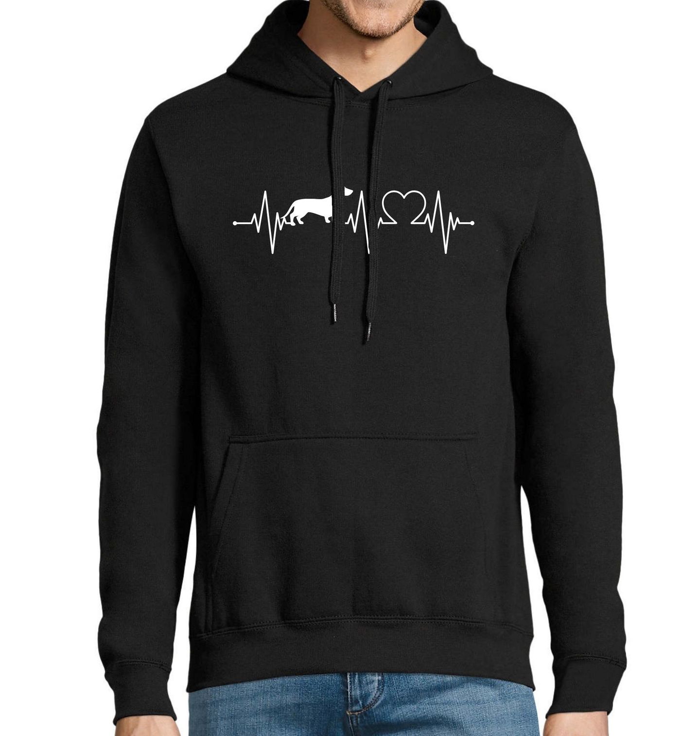 Pánská mikina Kardiogram lásky a Jezevčík. Uprostřed linie připomínající kardiogram stojí silueta plemene jezevčík, doplněná o srdce, protože pes je prostě člen rodiny. Ideální pro každého pejskaře, kterému srdce bije v rytmu psích tlapek a radostného vrtění ocasu. Skvělý dárek pro všechny, kdo milují svého jezevčíka nade vše.
