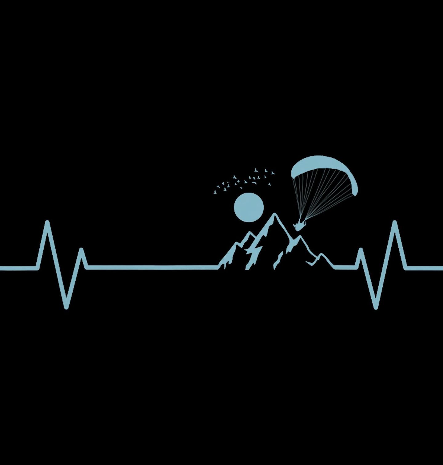 Pánské tričko Kardiogram Parašutisty. Minimalistický motiv spojuje křivku srdečního tepu s horami, měsícem a siluetou parašutisty s otevřeným padákem. Design symbolizuje, že skutečný život začíná ve chvíli, kdy parašutista vyskočí z letadla a pocítí svobodu letu. Grafika je ideální pro milovníky skydivingu, dobrodružství a života plného adrenalinu.