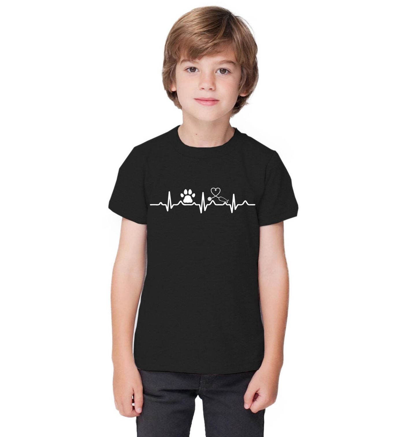Dětské tričko Kardiogram Veterináře. Citlivý a symbolický motiv, kde se kardiogram prolíná s tlapkou a stetoskop se mění v srdce. Design vyjadřuje lásku ke zvířatům, péči a empatii, které jsou základem práce, již představuje zdravotnictví zaměřené na zvířata. Pes zde symbolizuje věrnost a důvěru, zatímco veterinář je tím, kdo stojí na stráži zdraví a života.