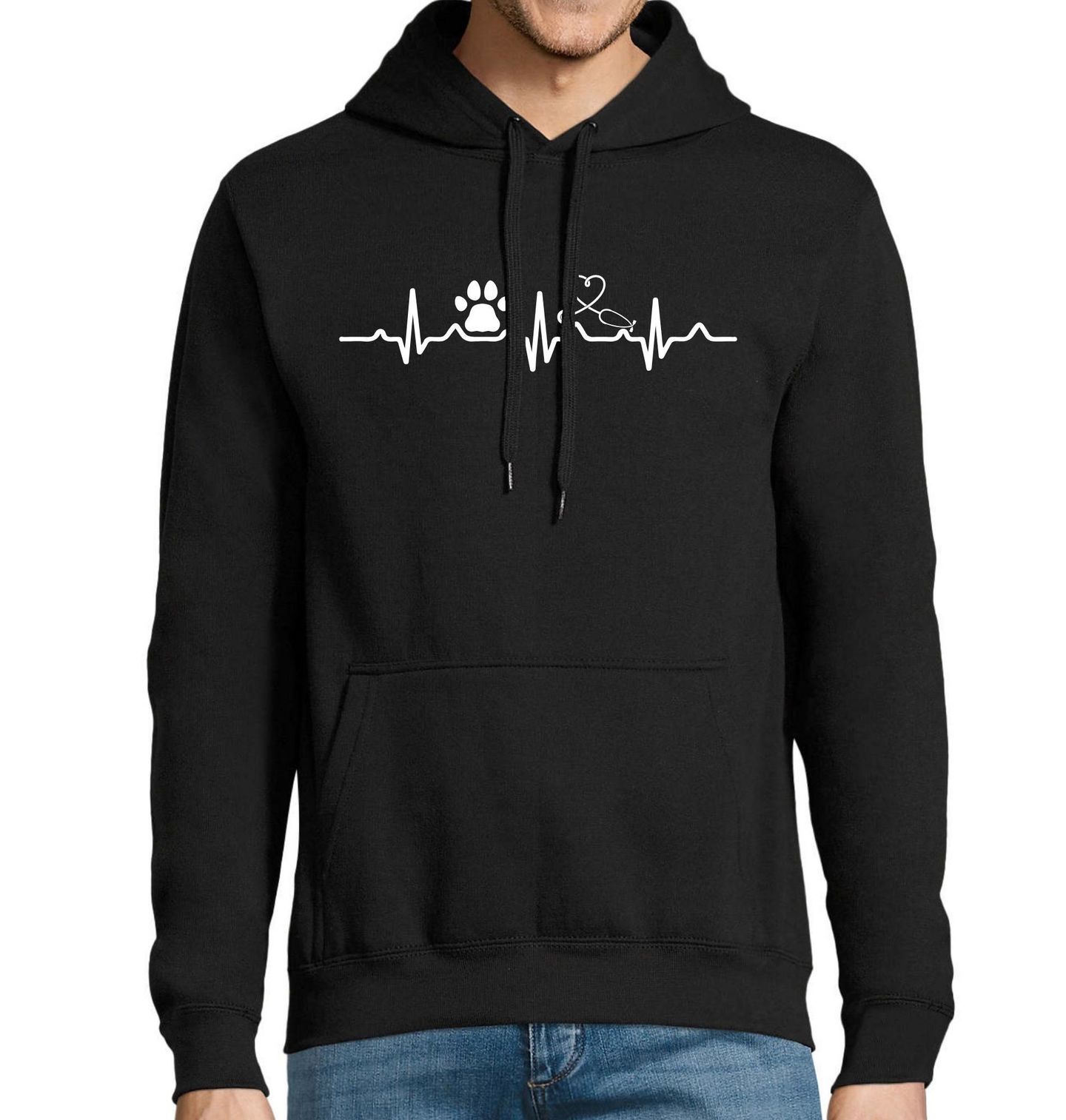 Pánská mikina Kardiogram Veterináře. Citlivý a symbolický motiv, kde se kardiogram prolíná s tlapkou a stetoskop se mění v srdce. Design vyjadřuje lásku ke zvířatům, péči a empatii, které jsou základem práce, již představuje zdravotnictví zaměřené na zvířata. Pes zde symbolizuje věrnost a důvěru, zatímco veterinář je tím, kdo stojí na stráži zdraví a života.