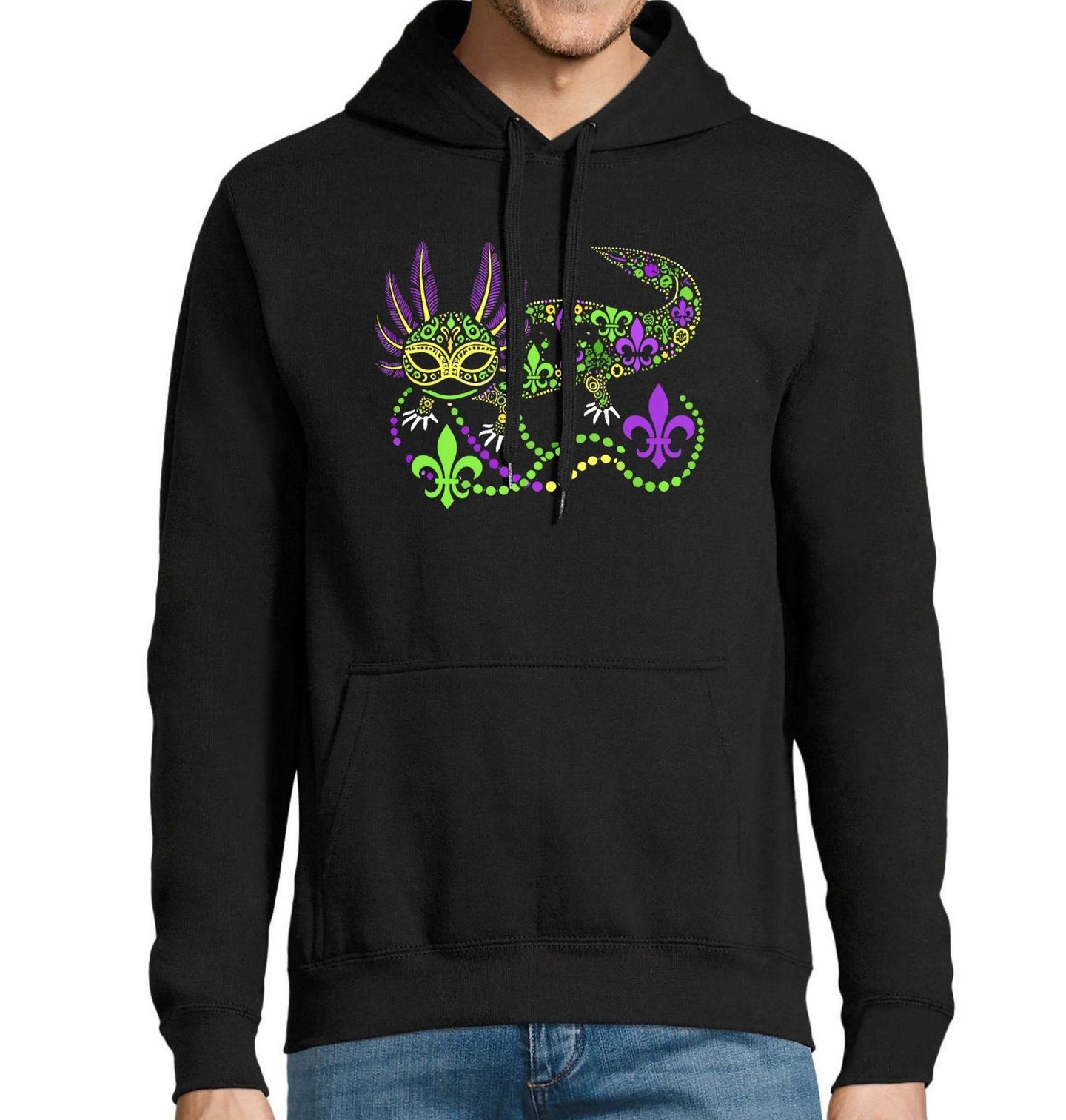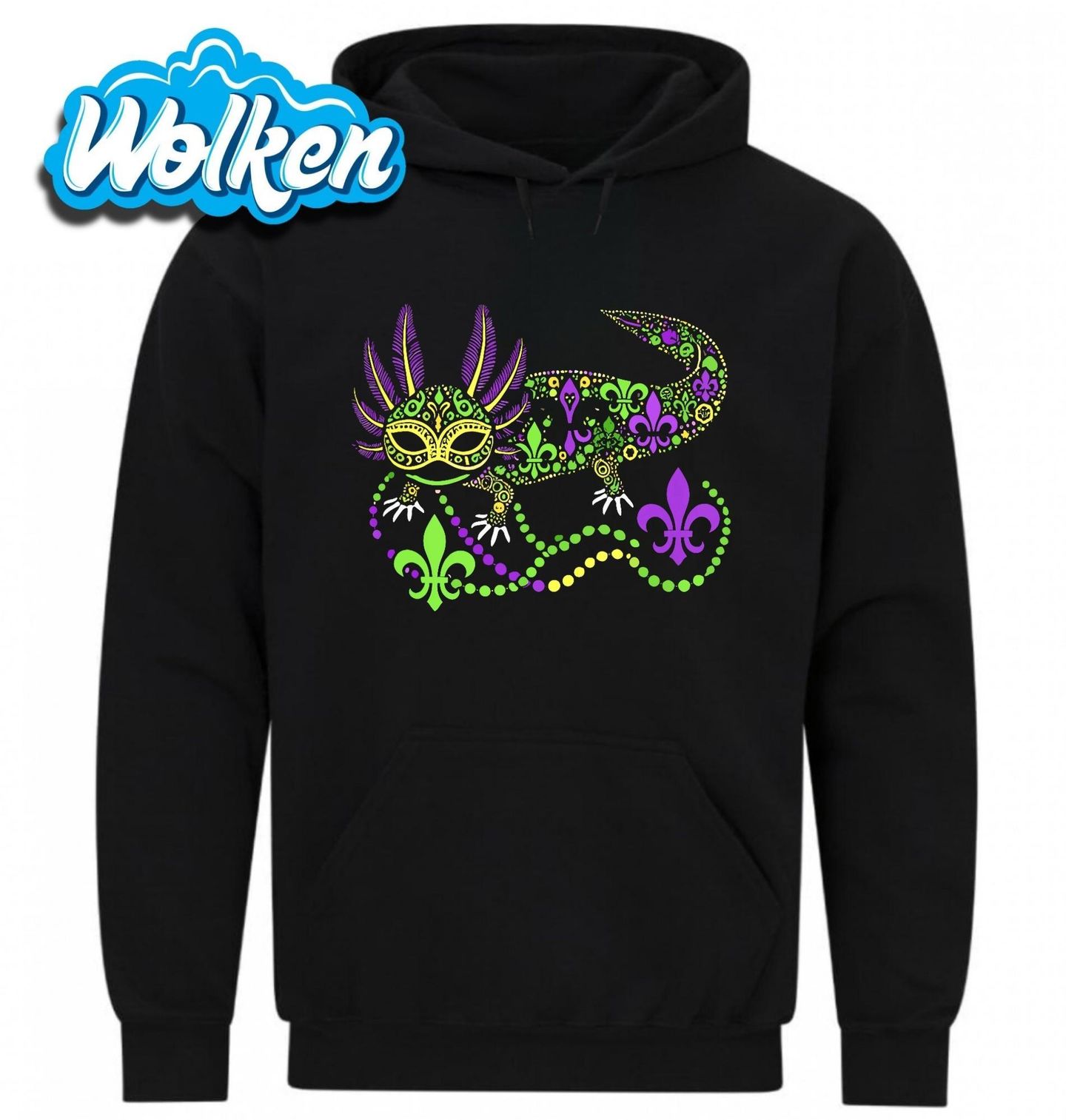 Pánská mikina Karnevalový Axolotl. Axolotl inspirovaný slavnostní atmosférou Mardi Gras! Mardi Gras znamená „Tučný úterý“ a slaví se den před Popeleční středou, kdy začíná půst. Je to tradiční karneval plný masek, kostýmů, hudby a tance. Nejznámější oslavy probíhají v New Orleans, kde se nosí barvy fialová (spravedlnost), zelená (víra) a zlatá (moc).