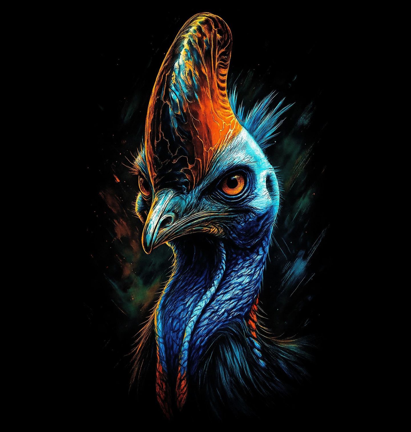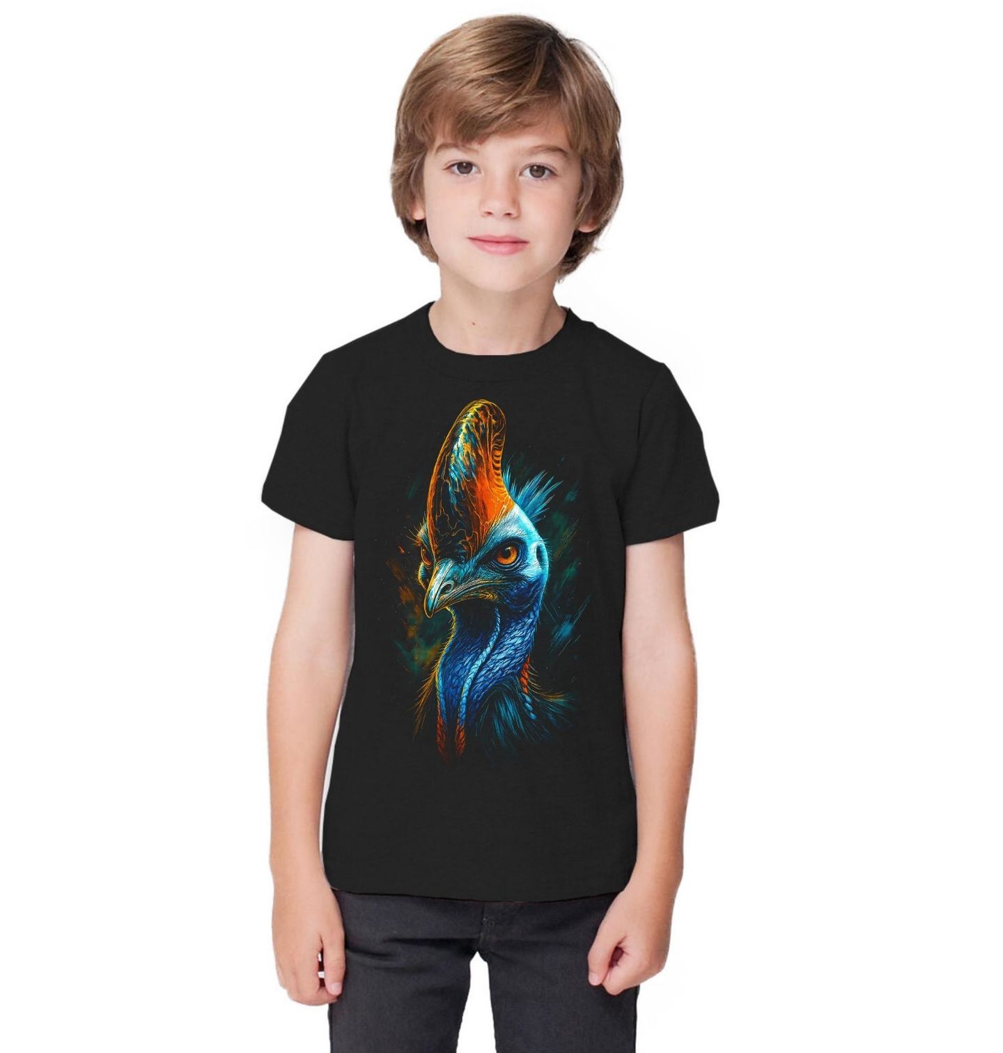Dětské tričko Kasuár přílbový. Silný a originální motiv zobrazuje majestátního tvora připomínajícího druh kasuar (Casuarius casuarius). Tento výrazný pták je známý svou charakteristickou kostěnou „přilbou“ na hlavě a intenzivními barvami, které mu dodávají jedinečný vzhled. Ilustrace zachycuje dramatickou energii a exotickou atmosféru tropické přírody.