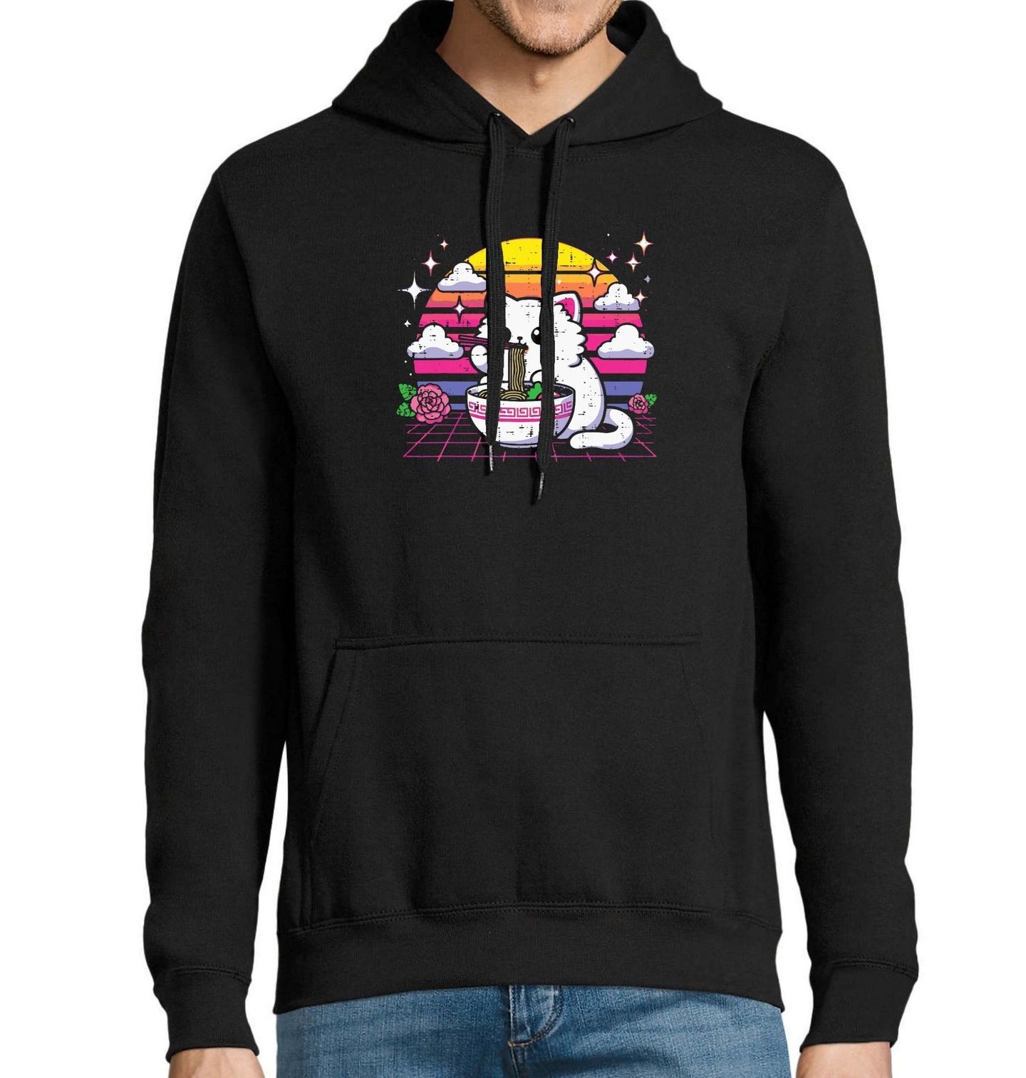 Pánská mikina Kawaii Kočka a Miska Ramenu Vaporwave. Na obrázku je bílá kočka, která sedí před velkou miskou ramen a spokojeně si vychutnává nudle hůlkami. V pozadí září barevný retro západ slunce s obláčky a hvězdičkami v neonových barvách. Tento motiv je ideální pro všechny, kdo milují kawaii styl a Japonsko.