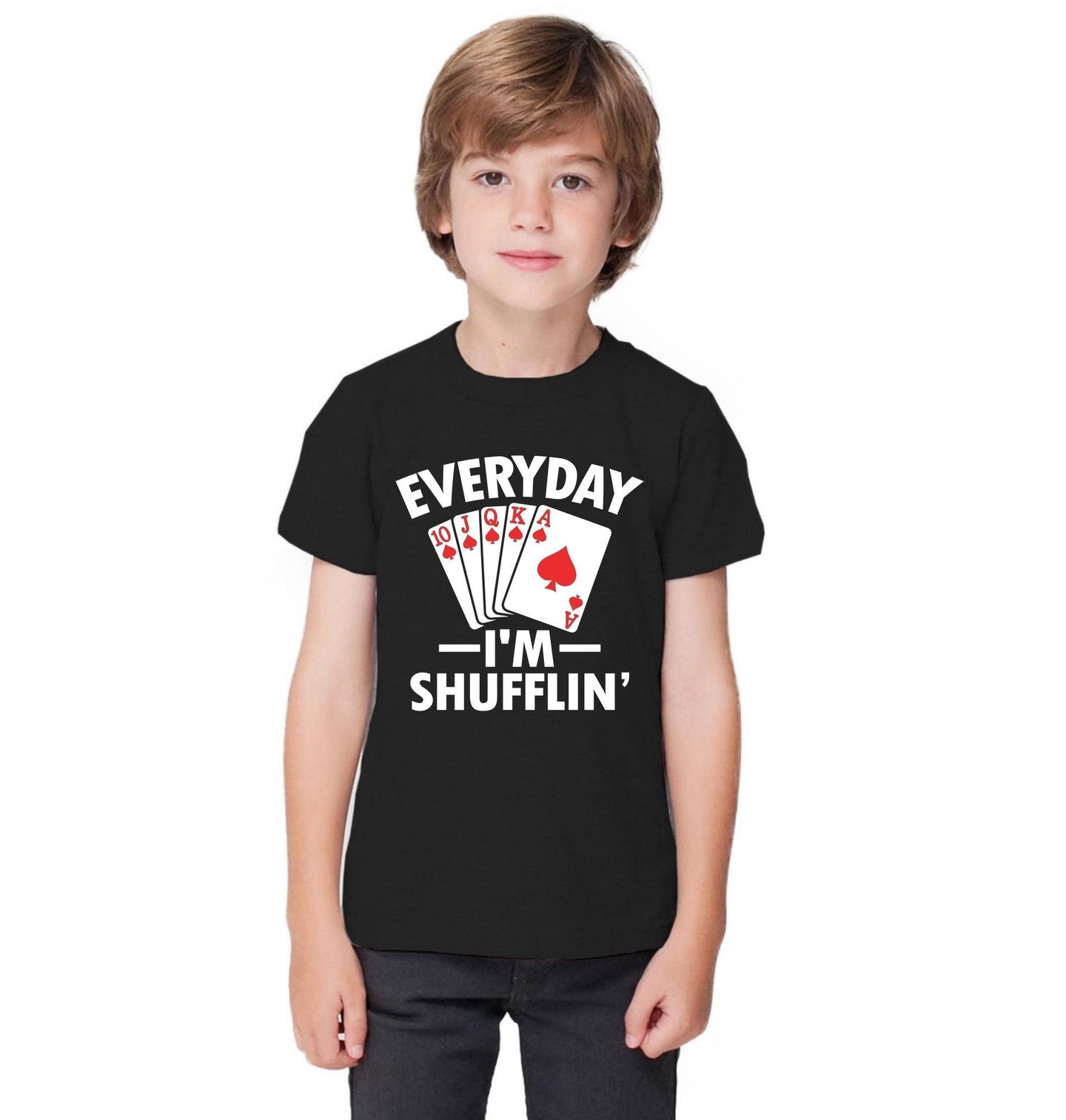 Dětské tričko Každý den míchám karty Everyday I’m Shufflin’. Na obrázku je silná pokerová kombinace královská postupka (Royal Flush) v pikách – karty 10, J, Q, K, A. Jde o nejsilnější možnou kombinaci v pokeru. Ten nápis „Everyday I’m Shufflin’“ je parodie na song: Party Rock Anthem“ – LMFAOV originále se v refrénu opakuje hláška: „Everyday I’m shufflin“.