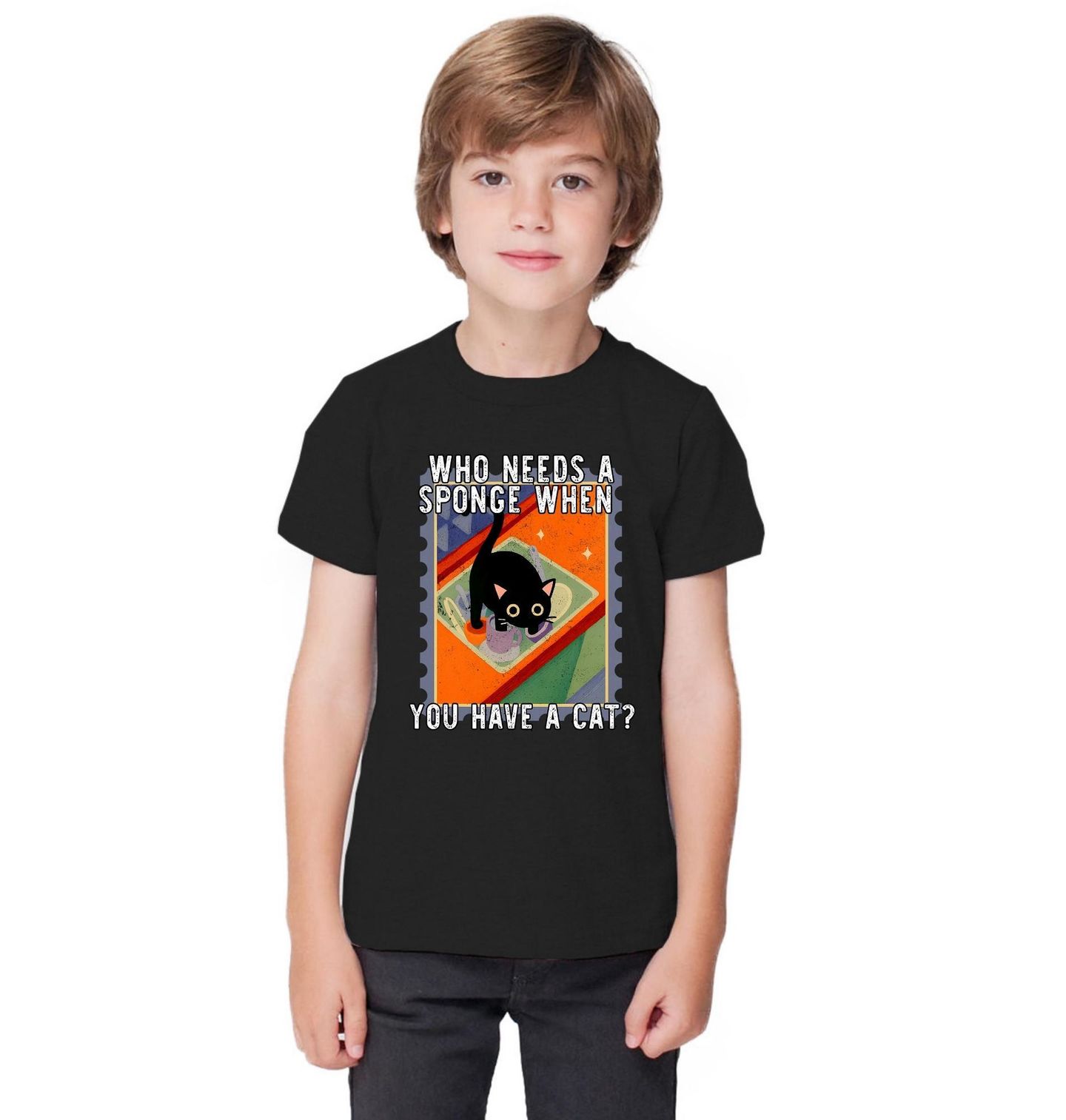 Dětské tričko Kdo potřebuje houbičku, když má kočku? Who needs a sponge when you have a cat? Tento vtipný ilustrativní motiv zachycuje černou kočku, která si hoví přímo v kuchyňském dřezu mezi hrnky a nádobím – přesně tam, kde by měla být houbička. Humorný design dokonale vystihuje realitu každého majitele koček – kočka je zkrátka všude, vždy a u všeho.
