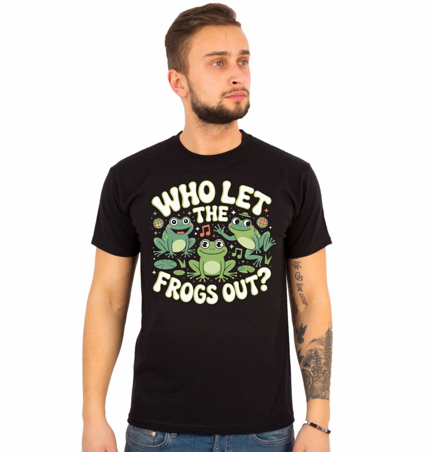 Pánské tričko Kdo pustil žáby ven? Who Let the Frogs Out? Zábavný a energický motiv, který rozjede každou náladu! Hlavní roli zde hraje veselá žába a její parta, která tančí, baví se a šíří dobrou atmosféru. Tento motiv je hravou parodií na známý hudební hit a funguje jako chytlavé meme, které si okamžitě zapamatuješ. Barevné prvky, hudební symboly a roztomilé postavičky žab dodávají designu pozitivní energii a party vibe.