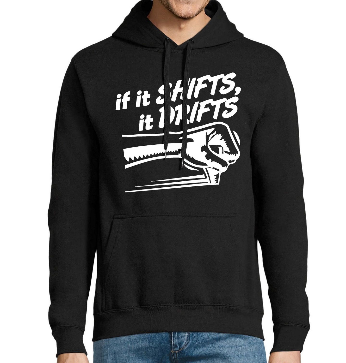 Pánská mikina Když to řadí, tak to driftuje. Originální motiv s nápisem „If it shifts, it drifts“ je jasným vyjádřením drift filozofie. Tento design spojuje humor, rychlost a vášeň pro auto v jediné výrazné grafice, která zaujme každého fanouška smyků a zadokolky. Motiv doplňuje stylizovaná ilustrace řadicí páky, která symbolizuje kontrolu nad výkonem a radost z jízdy.