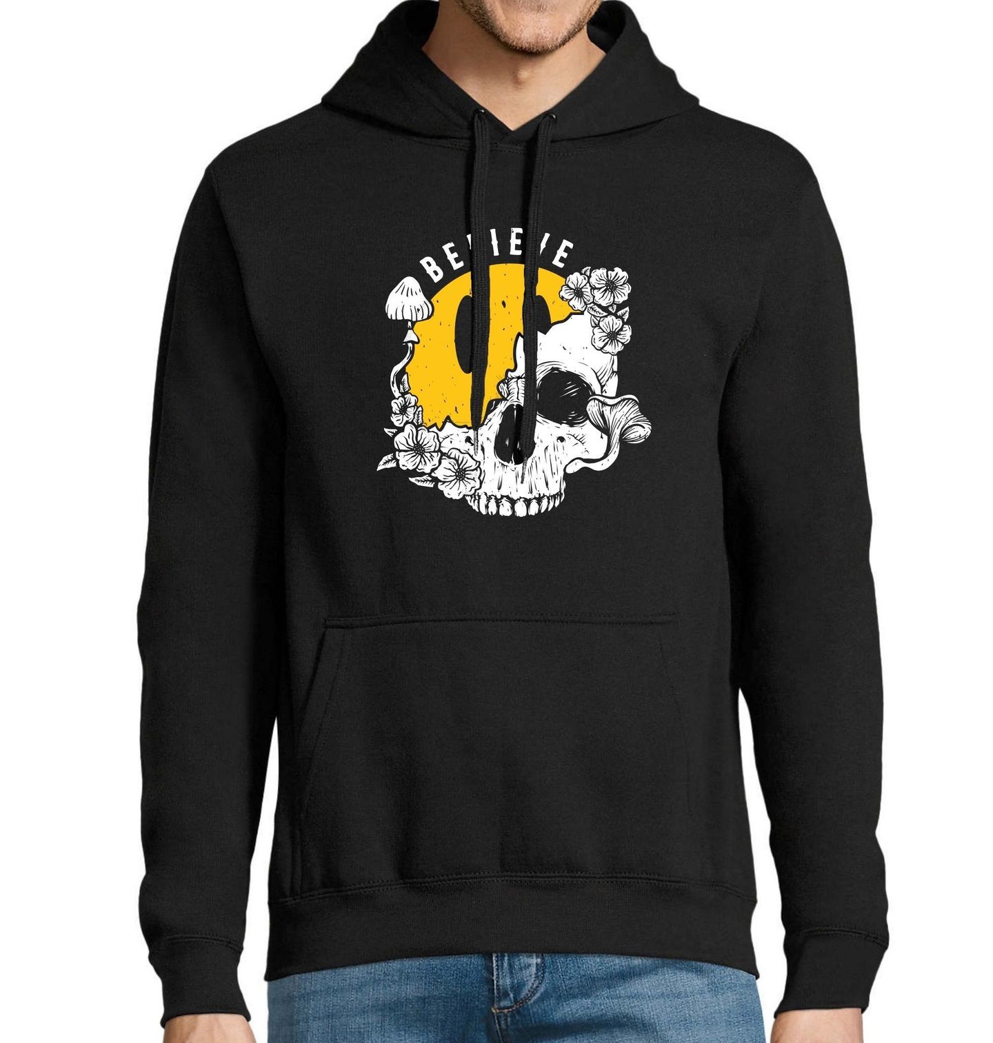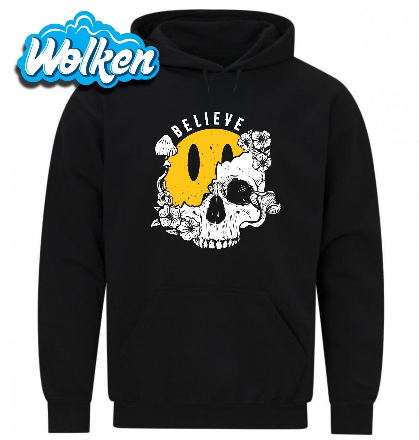 Pánská mikina Když Věříš, Vzrosteš Smajlík z lebky. Když se rozpadne úsměv a zůstane jen lebka… věř. Stylový kontrast mezi smrtí, psychedelií a křehkou krásou květin. Pro ty, co se nebojí ponořit do hloubky, kde se temnota potkává se světlem a ironie se stylem.