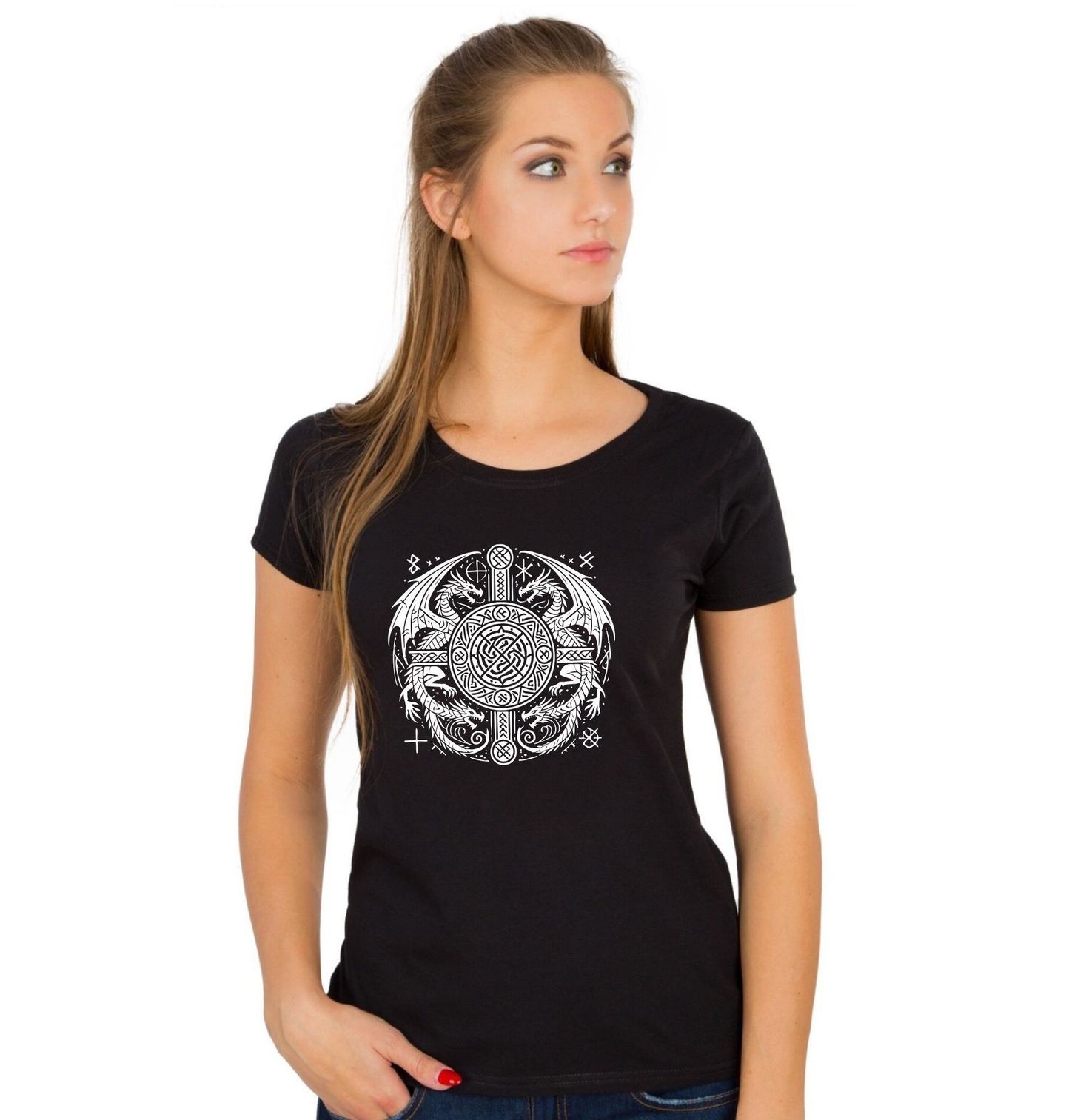 Dámské tričko Keltský Drak. Tento jedinečný motiv spojuje mystiku dávných kultur – legendární drak je zde vyobrazen ve stylu, který připomíná umění, jaké vytvářeli keltové a vikingové. Uprostřed dominuje keltský uzel a kruhový symbol, kolem kterého se vine několik mocných draků s typickými skandinávskými a keltskými ornamenty.