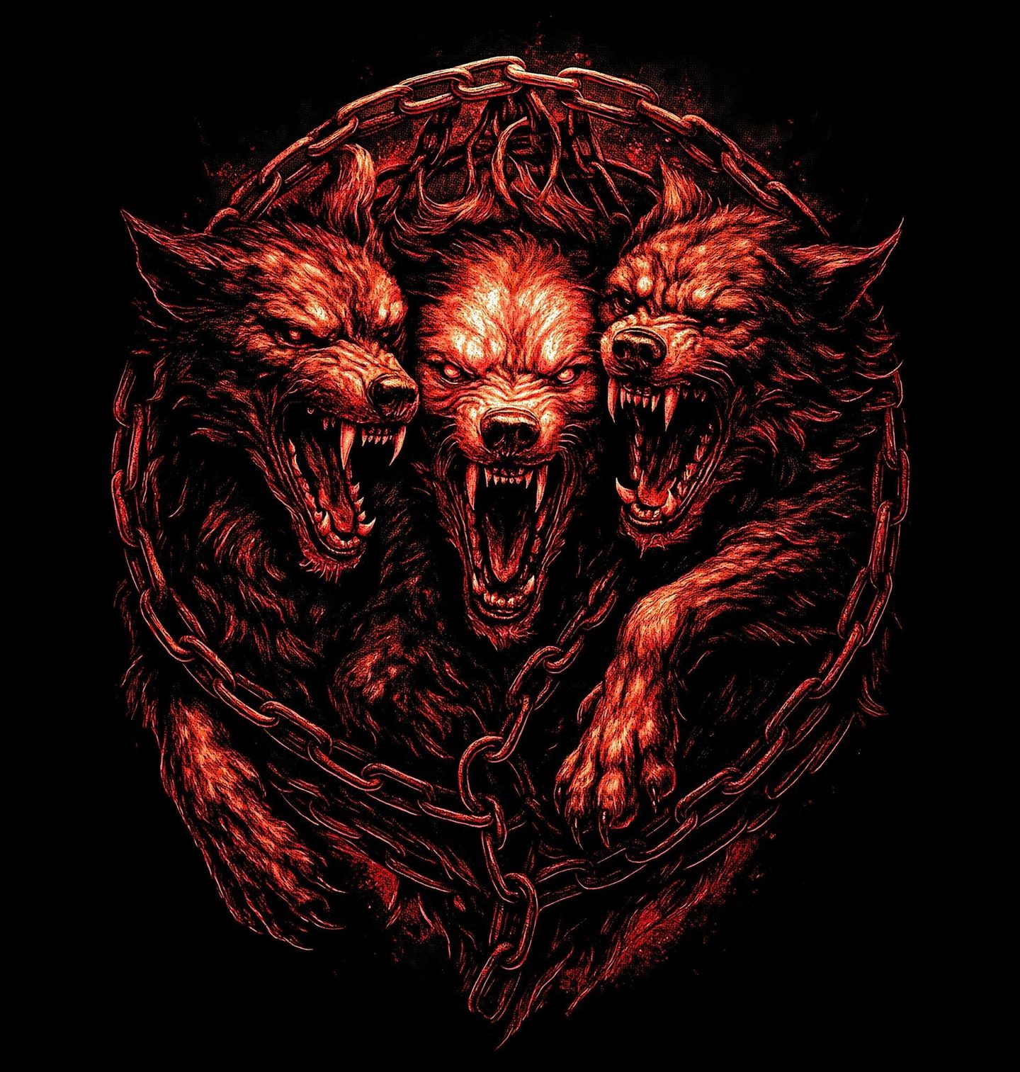 Pánské tričko Kerberos Strážce podsvětí. Silný a temný motiv zachycuje Kerbera, legendárního trojhlavého psa, kterého řecká mytologie popisuje jako neúprosného strážce hranice mezi světem živých a říší mrtvých. Tři rozzuřené hlavy symbolizují bdělost, sílu a absolutní kontrolu nad každým, kdo by se pokusil překročit zakázanou hranici.