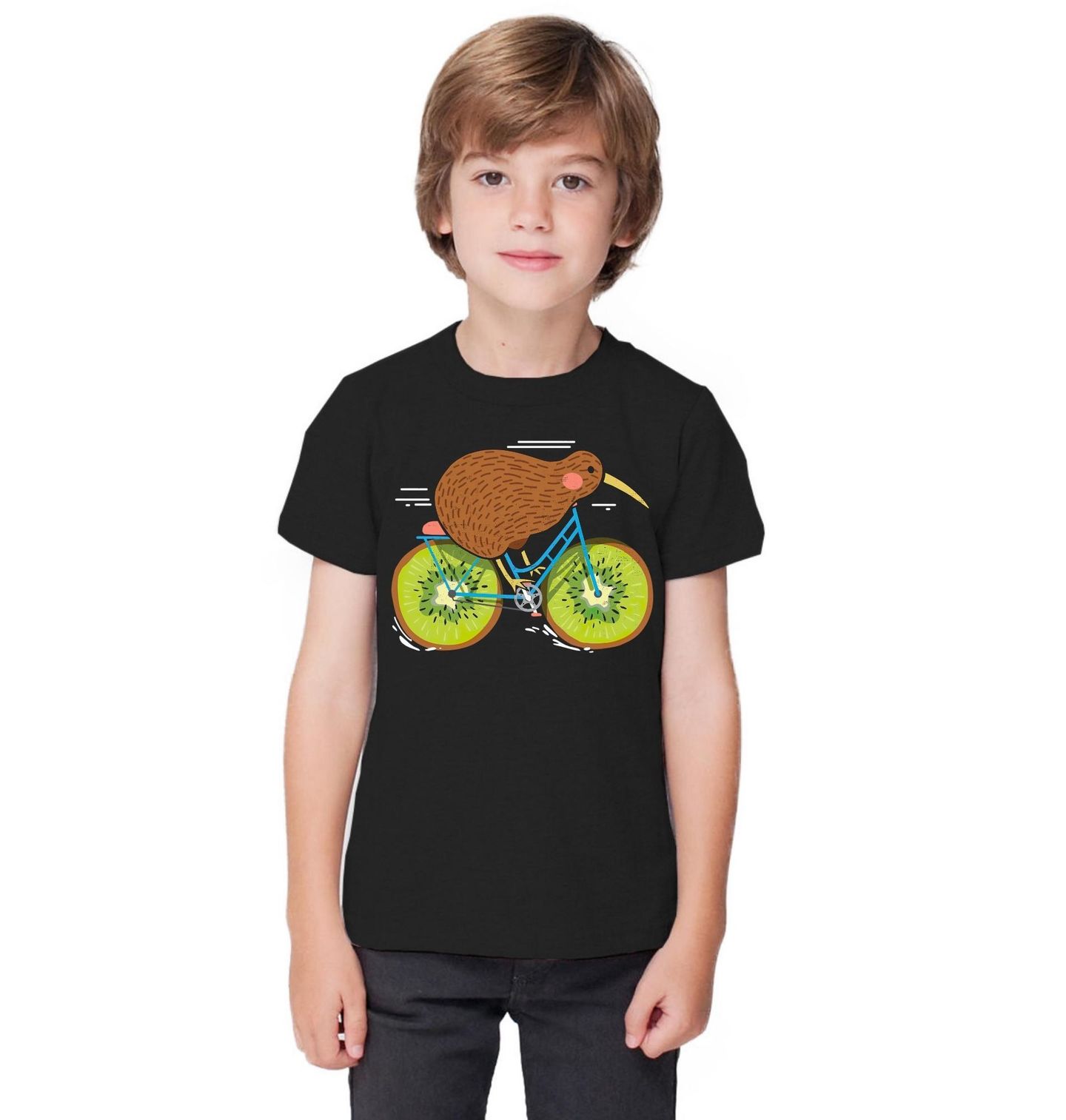 Dětské tričko Kiwi na Kole. Roztomilá ilustrace ukazuje ptáka kiwi jedoucího na kole s koly z ovoce kiwi. Ideální pro milovníky hravých a netradičních designů.