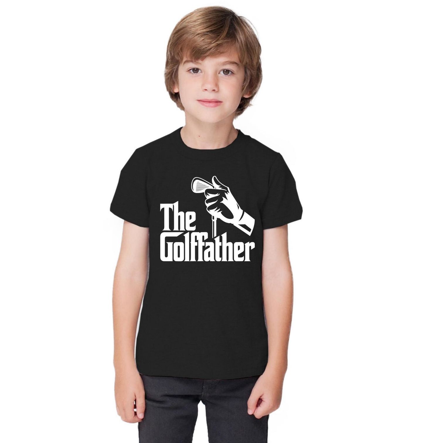 Dětské tričko Kmotr Golfu The GolfFather. Originální a vtipný motiv „The Golffather – kmotr golfu“ je stylová parodie na slavný film Kmotr (The Godfather) – jen místo mafiánského dona tu vládne greenu neohrožený mistr golfu. Typická silueta ruky držící golfovou hůl doplněná ikonickým písmem dává jasně najevo, kdo je skutečný vládce hřiště.
