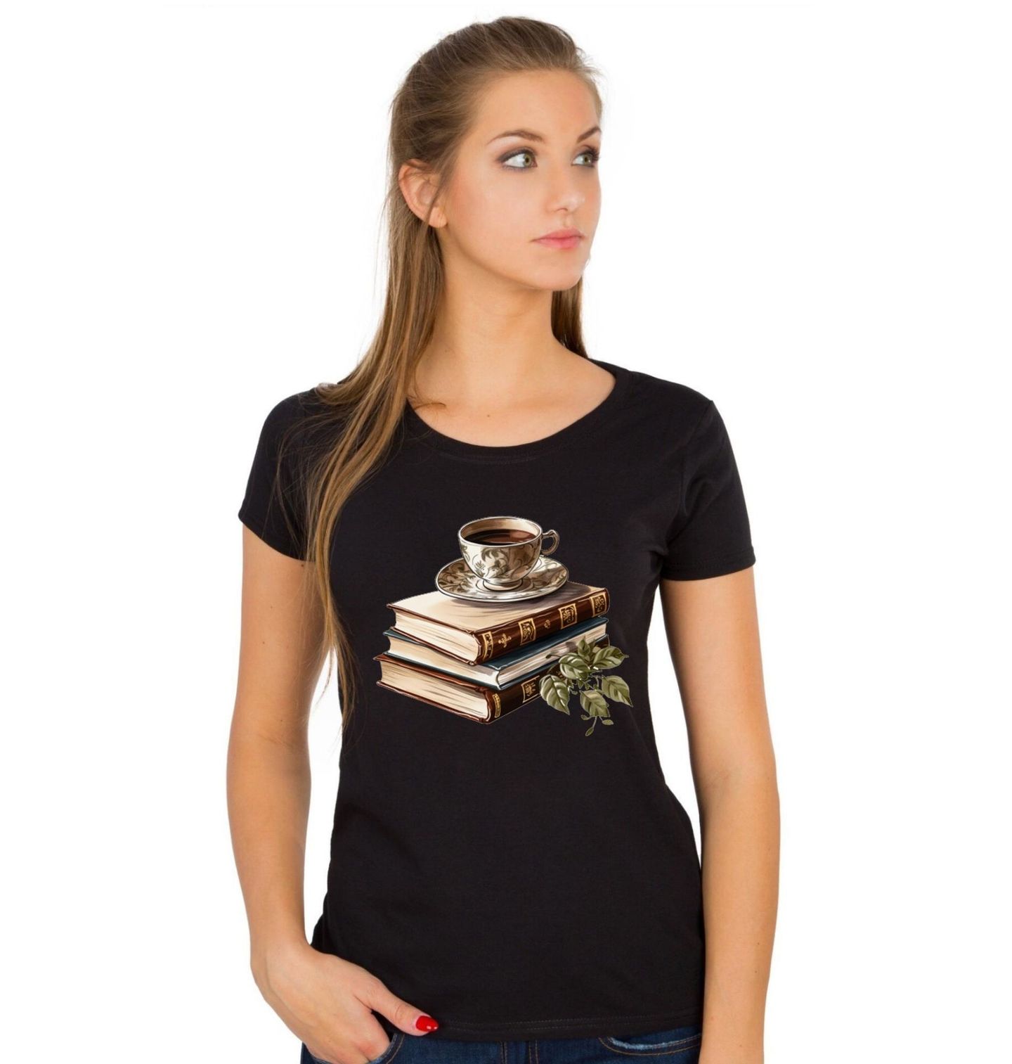 Dámské tričko Knihy s Šálkem Kávy. Tento design je ideální pro všechny milovníky čtení, kteří si neumí představit knihu bez šálku dobré kávy. Knihy symbolizují příběhy a myšlenky, čtení chvíle klidu a inspirace a káva dotváří pocit tepla a domácí pohody. Skvělá volba jako dekorace nebo dárek pro knihomoly, čtenáře i kavárenské duše.