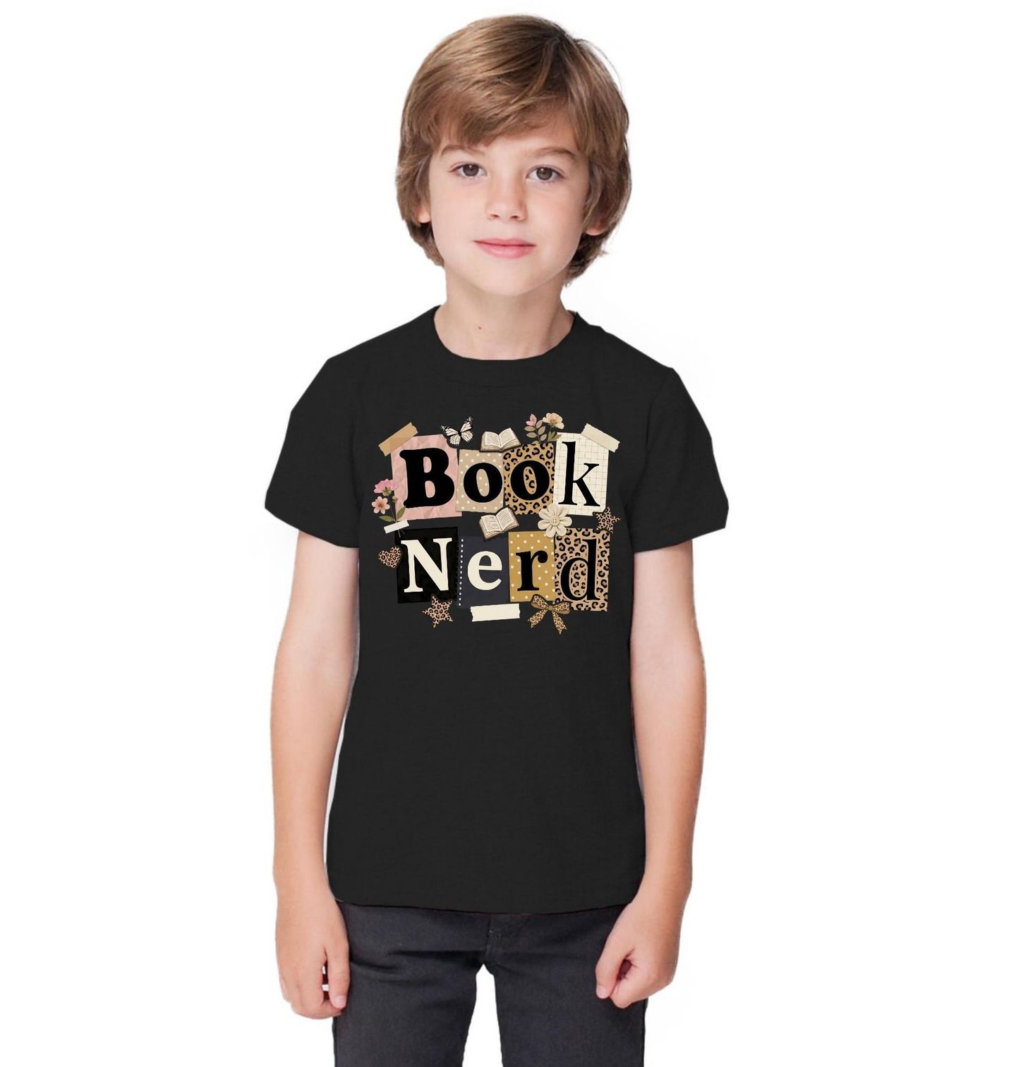 Dětské tričko Knižní Šprt Book Nerd. Moderní a výrazný motiv pro všechny, kteří milují čtení a svět knih. Nápis „Book Nerd“ (v překladu „knižní nadšenec“ nebo „milovník knih“) jasně vyjadřuje vášeň pro čtení a radost z objevování nových příběhů. Kolážový design doplňují ilustrace knih, květin, motýla a dekorativních prvků, které dodávají motivu hravý a stylový vzhled.