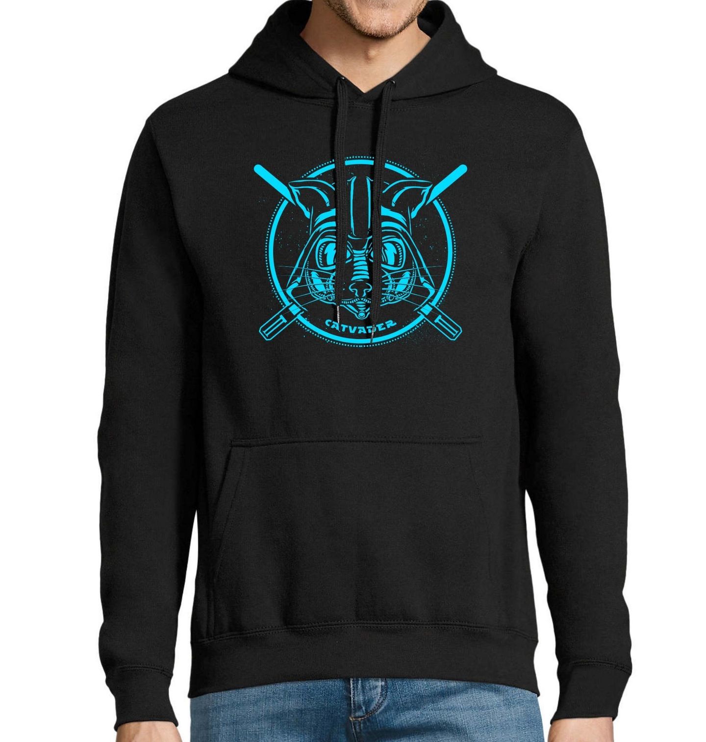 Pánská mikina Kočičí Catvader. Tento design "Cat Vader" je parodií na Darth Vadera z Hvězdných válek (Star Wars). Místo temného lorda Sithů zde vidíme kočičí verzi Vadera, doplněnou o ikonickou helmu a světelné meče. Je to skvělý mix humoru, geek kultury a lásky ke kočkám!