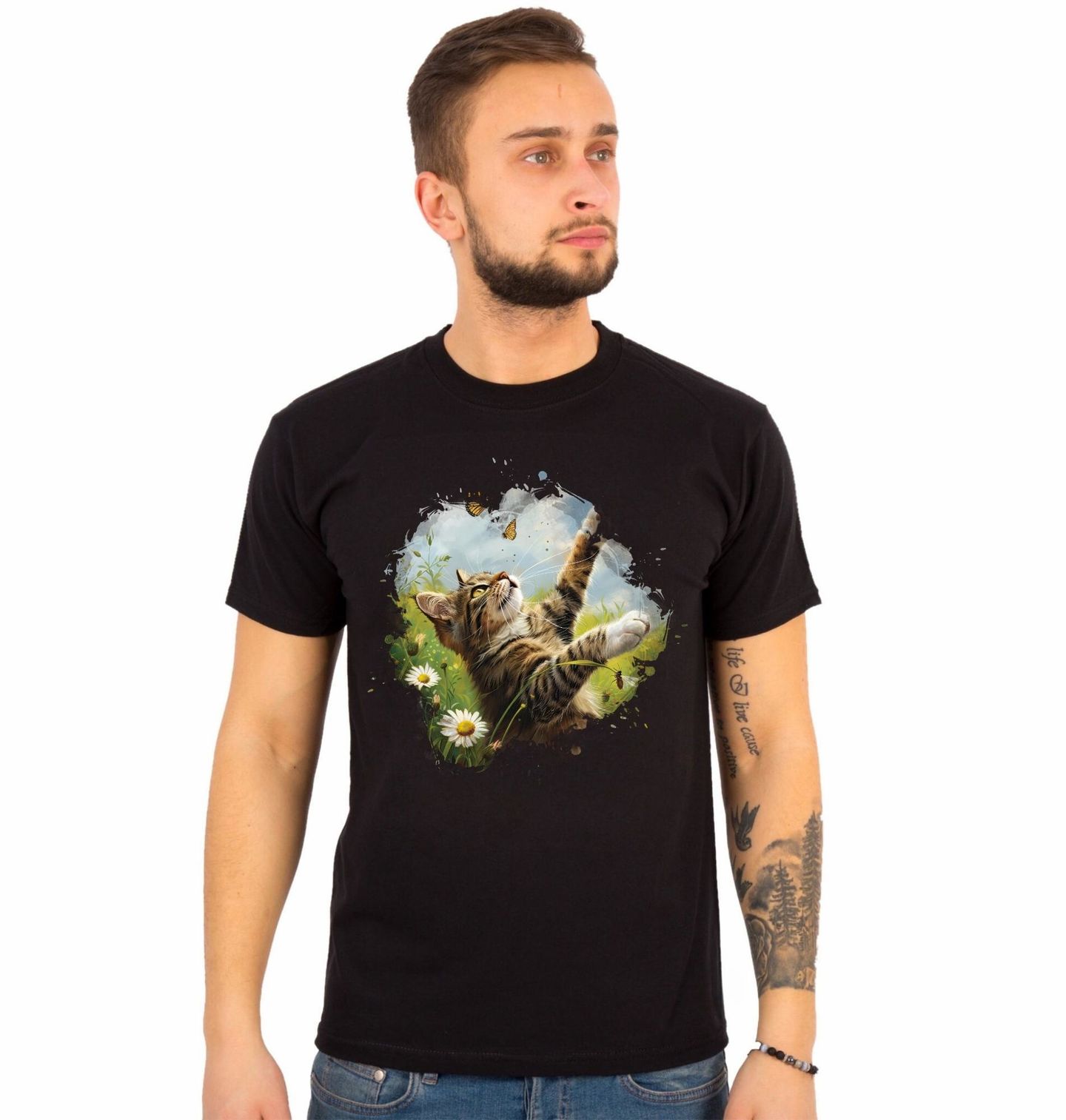 Pánské tričko Kočičí Dobrodružství s Motýly. Tenhle moment zná každý, kdo má doma chlupatého lovce. Kočka sedí v trávě, oči dokořán, tlapka připravená… a motýl si o kousek výš létá, jako by nic. Přesně ta kombinace soustředění, roztomilosti a marné snahy, která nás baví znovu a znovu. Motiv zachycuje hravost, klid přírody a nekonečnou zvědavost, kterou kočky tak milujeme.
