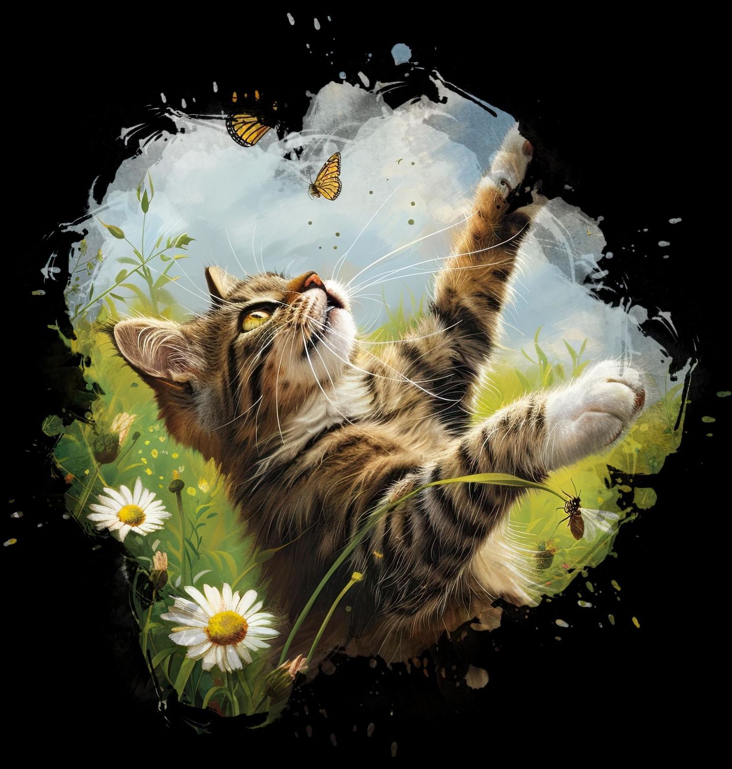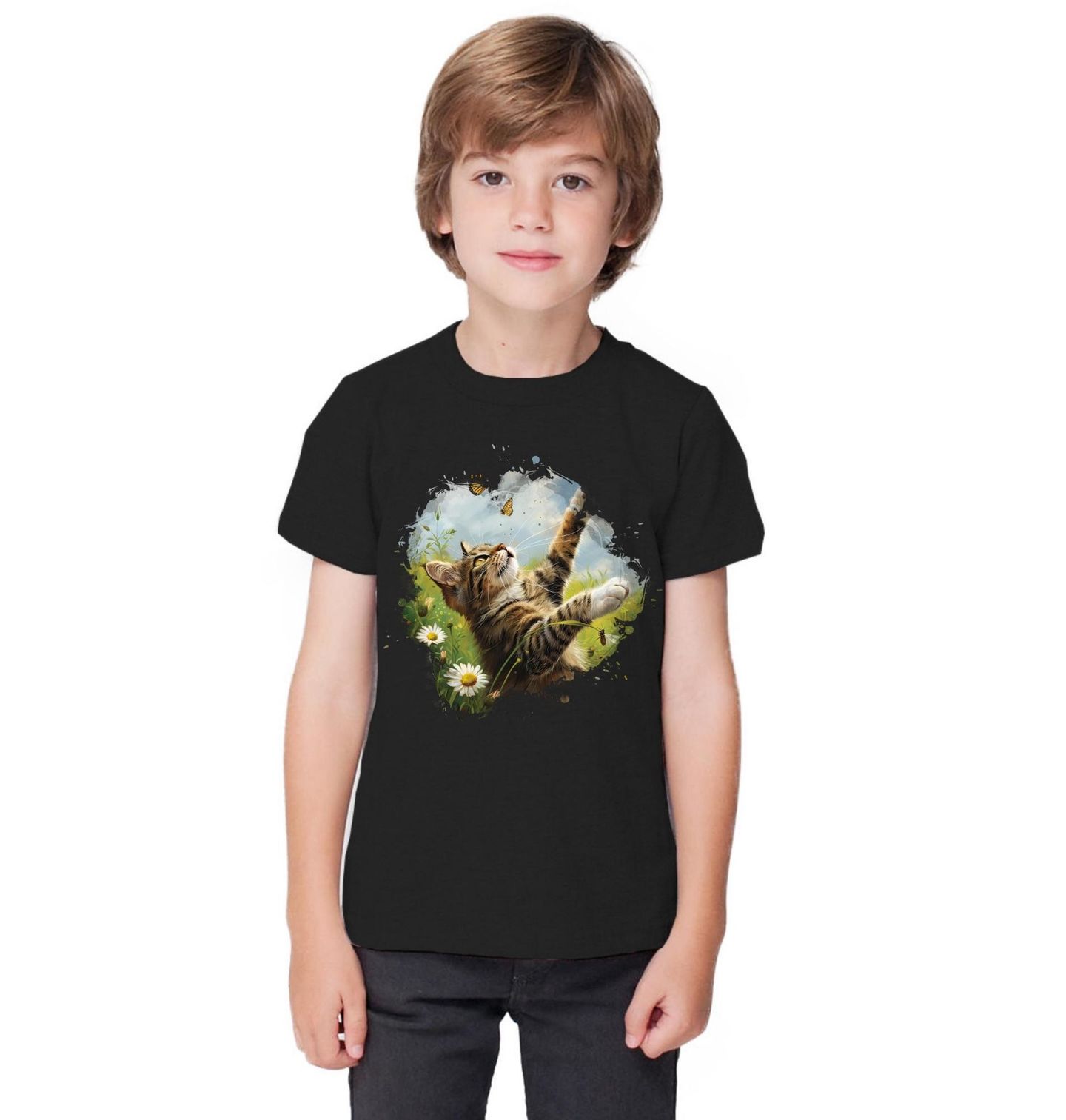 Dětské tričko Kočičí Dobrodružství s Motýly. Tenhle moment zná každý, kdo má doma chlupatého lovce. Kočka sedí v trávě, oči dokořán, tlapka připravená… a motýl si o kousek výš létá, jako by nic. Přesně ta kombinace soustředění, roztomilosti a marné snahy, která nás baví znovu a znovu. Motiv zachycuje hravost, klid přírody a nekonečnou zvědavost, kterou kočky tak milujeme.