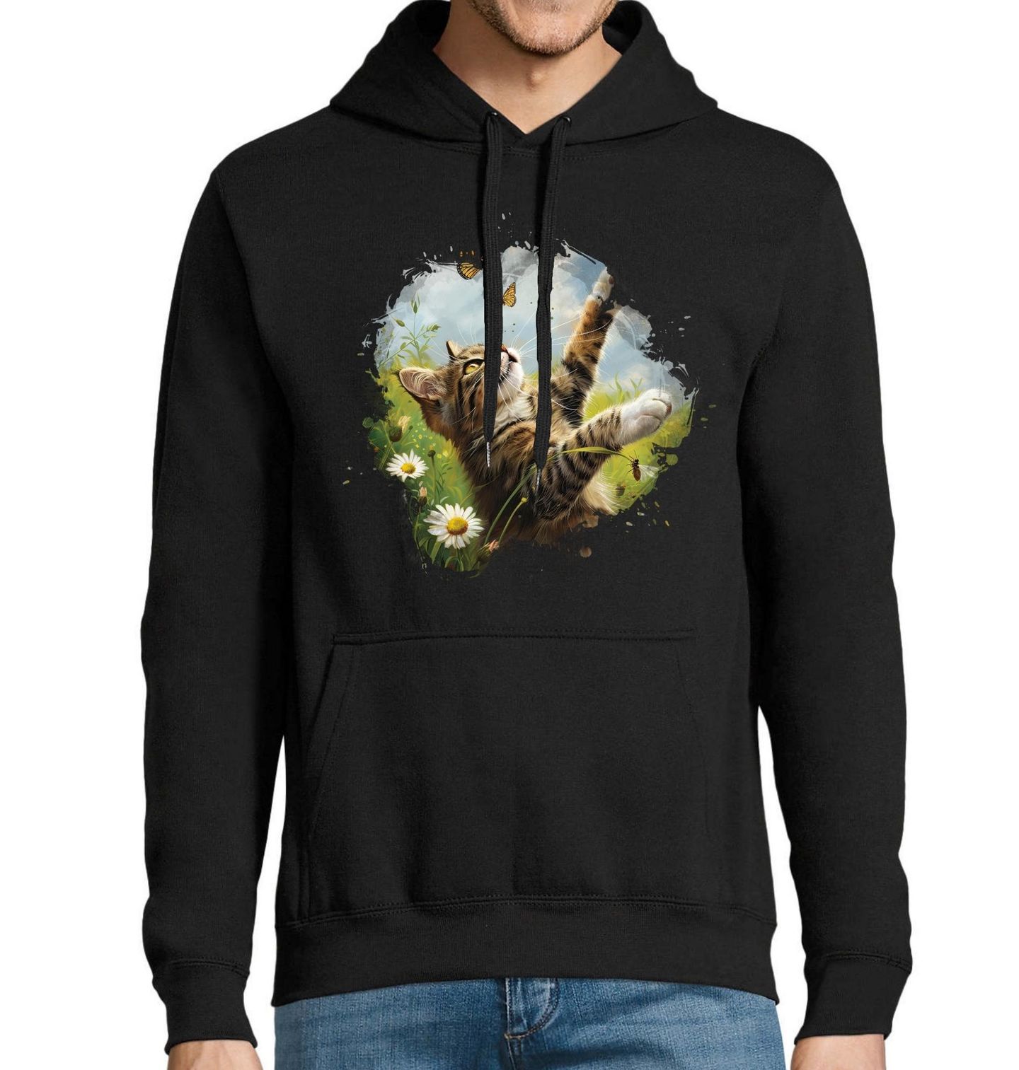 Pánská mikina Kočičí Dobrodružství s Motýly. Tenhle moment zná každý, kdo má doma chlupatého lovce. Kočka sedí v trávě, oči dokořán, tlapka připravená… a motýl si o kousek výš létá, jako by nic. Přesně ta kombinace soustředění, roztomilosti a marné snahy, která nás baví znovu a znovu. Motiv zachycuje hravost, klid přírody a nekonečnou zvědavost, kterou kočky tak milujeme.