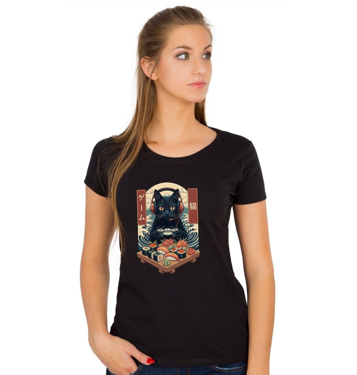 Dámské tričko Kočičí Gamer na Sushi. Tahle cool kočka s herním ovladačem sedí jako pravý hráč u stolu plného sushi, zatímco v pozadí se zvedají ikonické japonské vlny a majestátní hora Fudži. Design spojuje lásku ke gaming, humor i japonskou estetiku – ideální pro každého gamera, který miluje sushi a Japonsko.