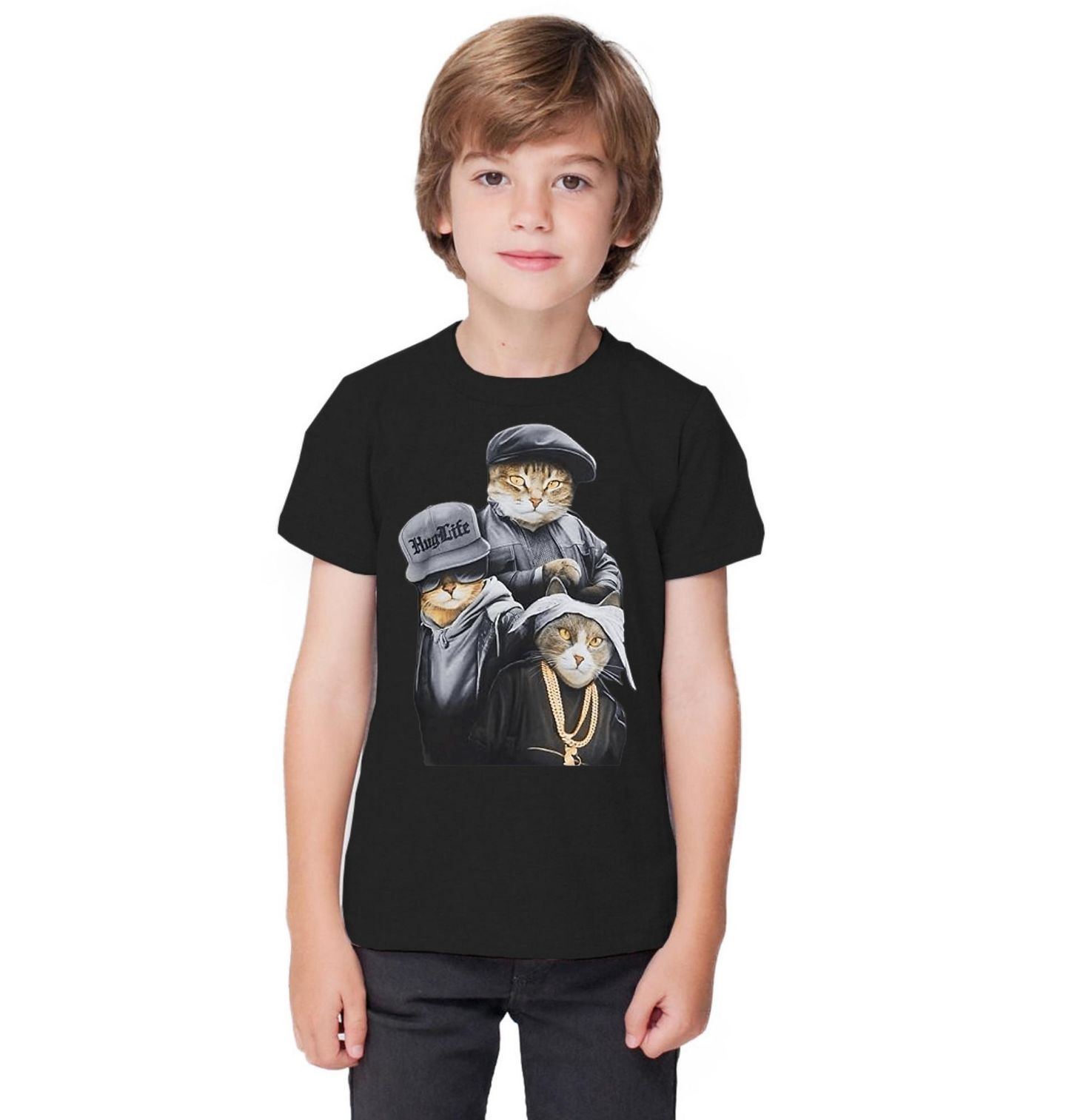 Dětské tričko Kočičí Gangsteři Hug Life. Drsný a stylový motiv, kde parta kočka vystupuje jako praví gangster bossové. V mikinách, kšiltovkách a se zlatými řetězy působí jako kočičí mafie z ulice – sebevědomí, respekt a styl v jednom. Motiv kombinuje humor a cool vzhled, takže je ideální pro všechny, kdo milují kočky, streetwear a trochu rebelství