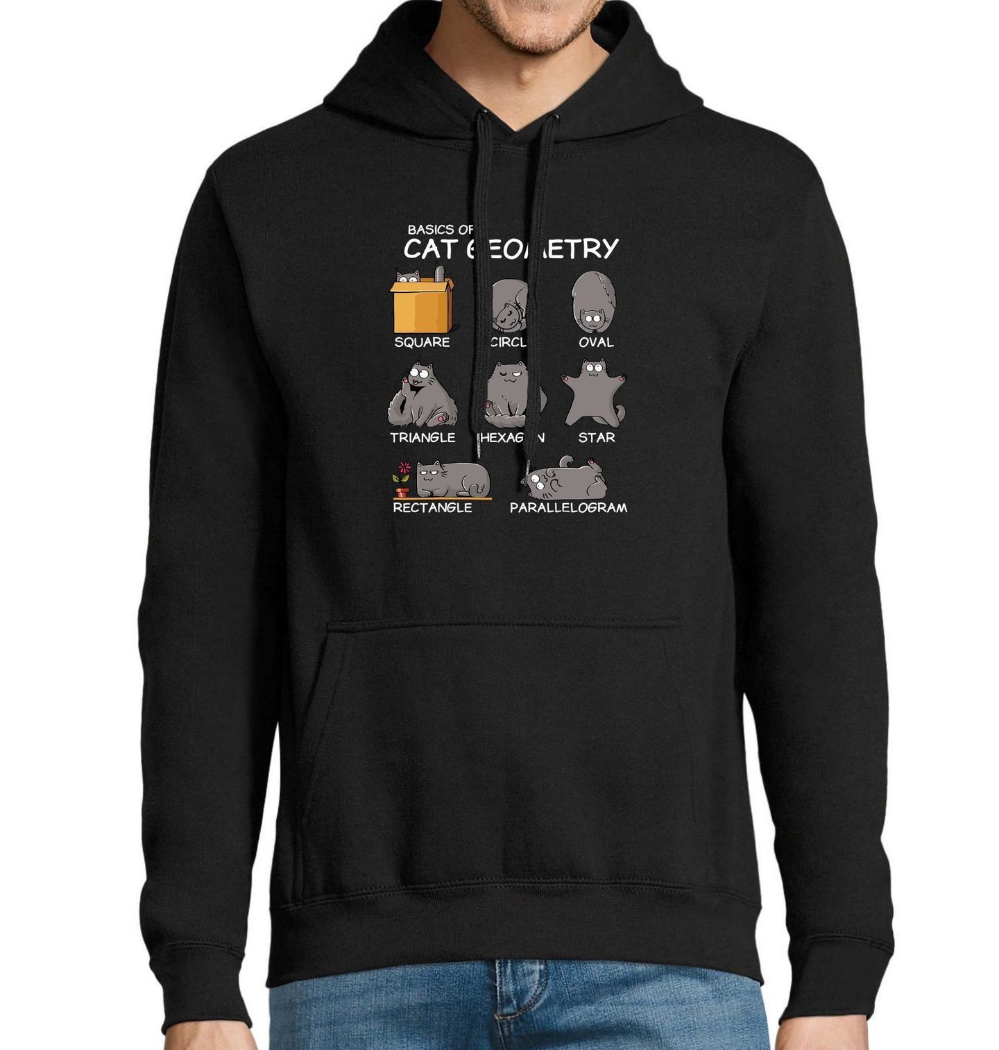 Pánská mikina Kočičí geometrie. Máš ráda kočky a miluješ zábavnou grafiku? Pak je tohle triko přesně pro tebe! „Kočičí geometrie“ ti s humorem ukáže, jak se chlupatí mazlíčci dokážou vtěsnat do jakéhokoli tvaru – od čtverce, přes kruh, ovál, hexagon, hvězdu až po paralelogram.