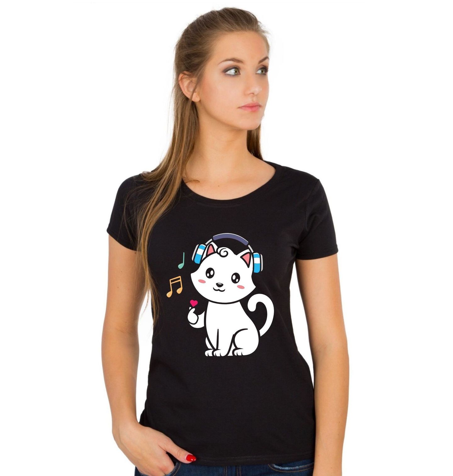Dámské tričko Kočičí K-pop fanoušek. Kočka se sluchátky, hudebními notami a gestem prstové srdce, které se stalo symbolem lásky, přátelství a pozitivní energie po celém světě. Tento design je ideální pro milovníky hudby, zvířat a korejské popkultury.