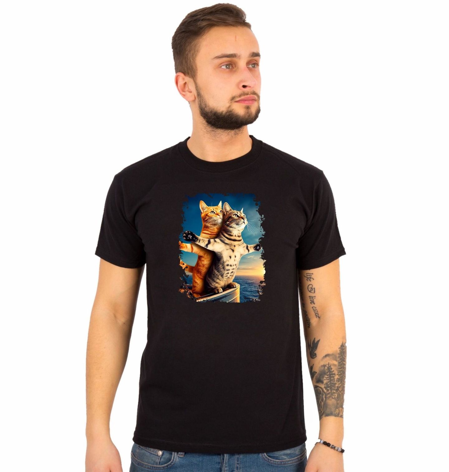 Pánské tričko Kočičí Láska na Titanicu I’m flying. Roztomilý a vtipný motiv, na kterém stojí dvě spokojené kočky na přídi lodi v ikonické romantické póze známé ze scény „já létám“ z filmu Titanic. Jedna kočka roztahuje tlapky do stran a druhá ji něžně objímá zezadu, zatímco za nimi zapadá slunce nad oceánem.