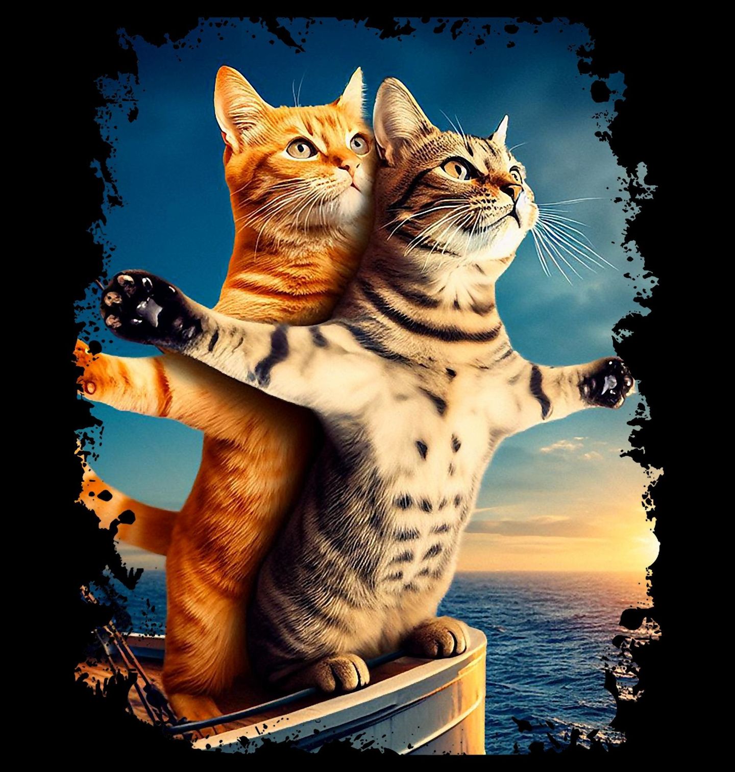 Pánská mikina Kočičí Láska na Titanicu I’m flying. Roztomilý a vtipný motiv, na kterém stojí dvě spokojené kočky na přídi lodi v ikonické romantické póze známé ze scény „já létám“ z filmu Titanic. Jedna kočka roztahuje tlapky do stran a druhá ji něžně objímá zezadu, zatímco za nimi zapadá slunce nad oceánem.