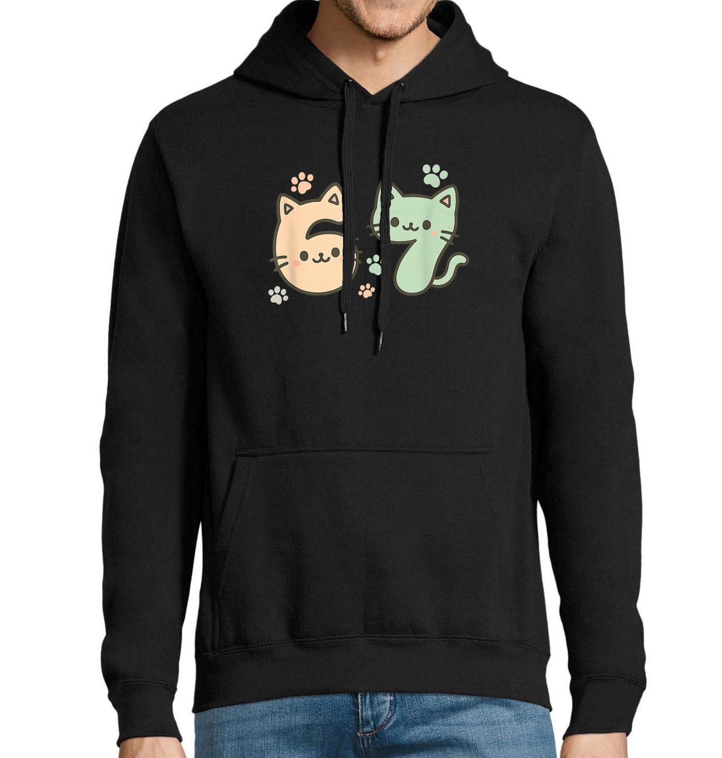 Pánská mikina Kočičí Meme 67 Six Seven. Roztomilý a hravý motiv 67 ve stylu meme, kde jsou čísla 6 a 7 proměněná v usměvavé kočky. Pastelové barvy, tlapky kolem a milý výraz dělají z tohoto designu ideální volbu pro každého, kdo miluje kočky. Nechybí ani anglický zápis six seven pro ještě větší vtip a originalitu.
