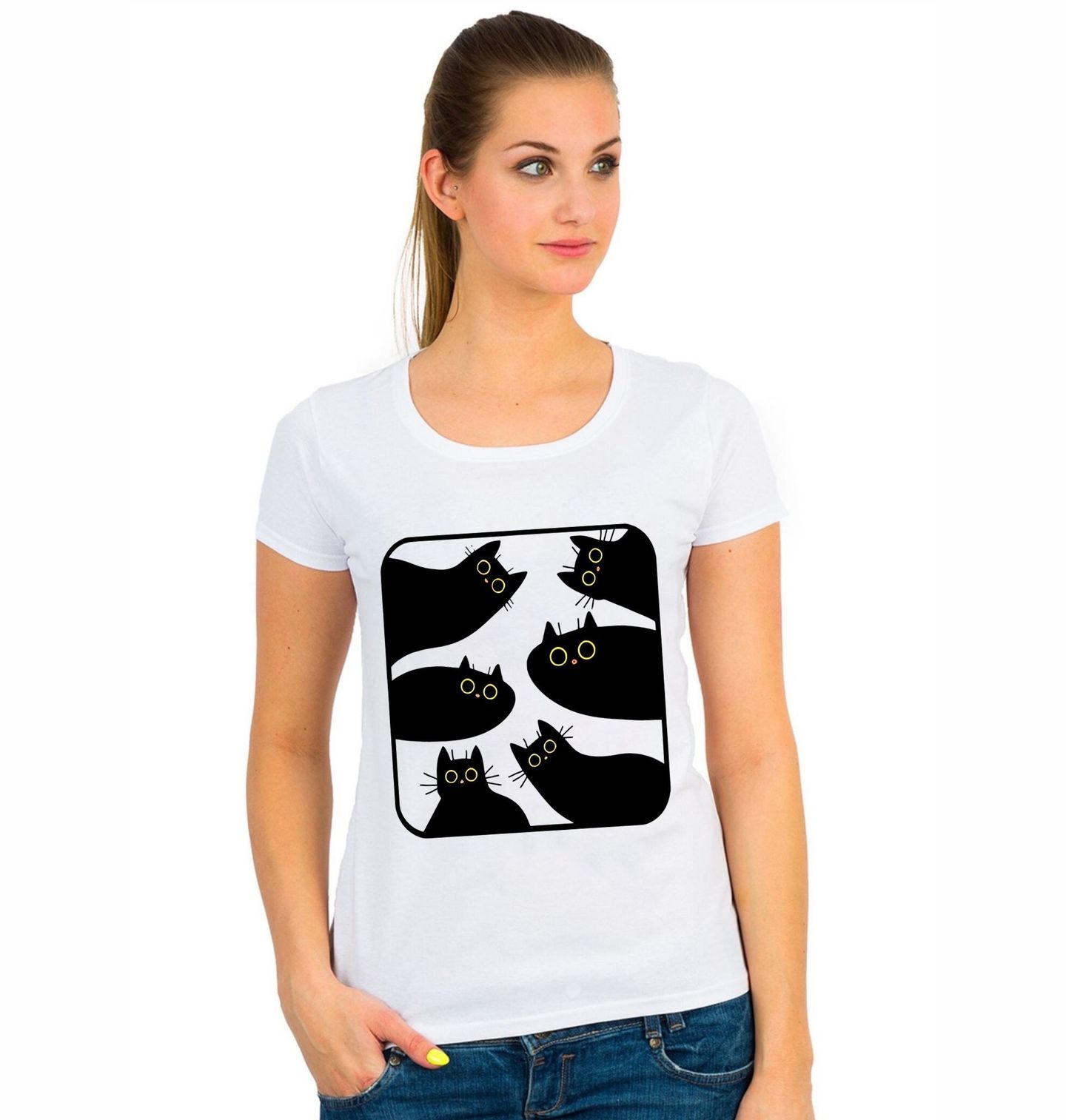 Dámské tričko Kočičí Minimalismus. Stylizovaný design několika černých koček s velkýma žlutýma očima, které vykukují z různých směrů. Jednoduchý, ale výrazný motiv vytváří hravou a lehce tajemnou atmosféru.