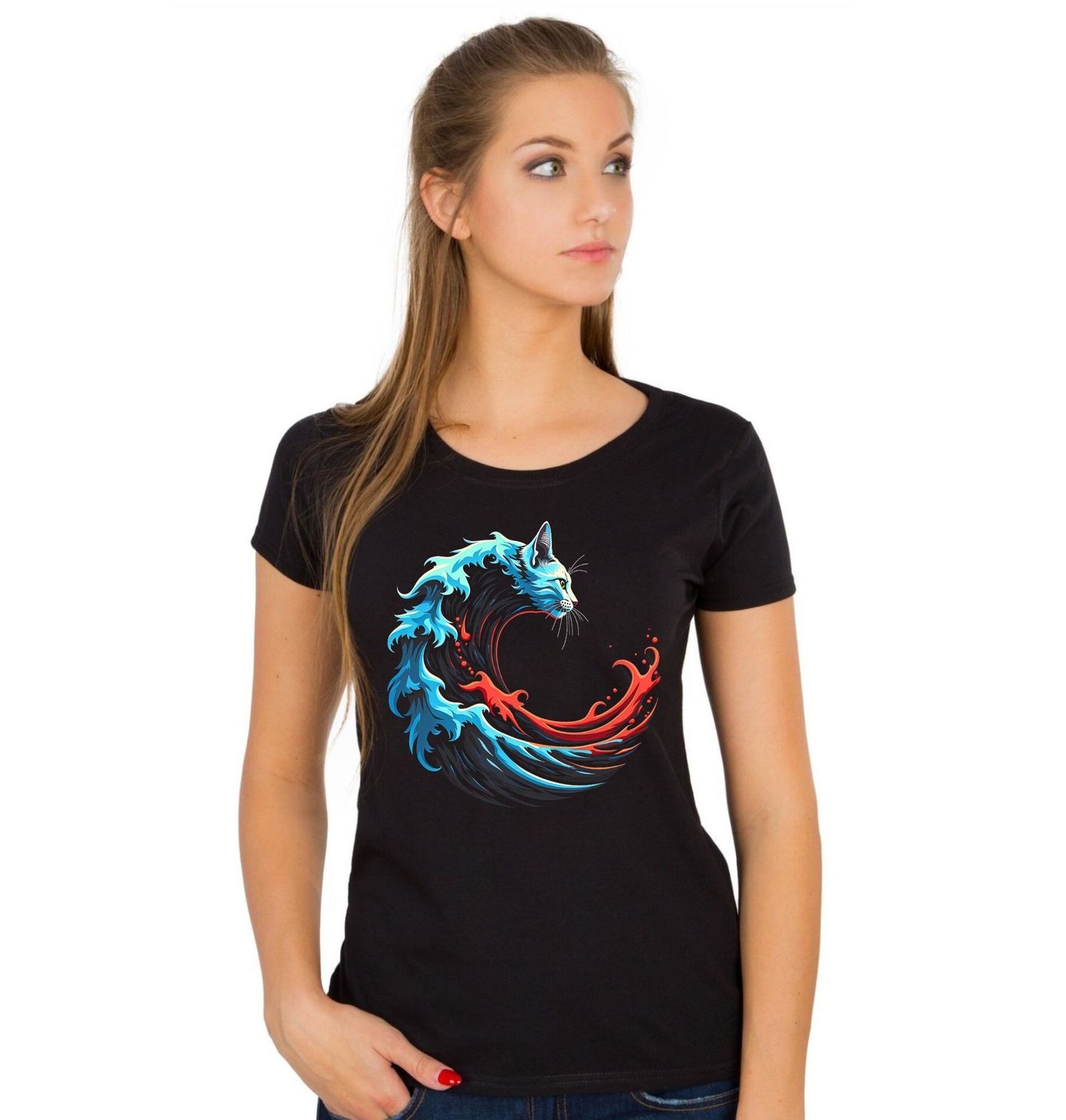 Dámské tričko Kočičí Mořská Vlna. Originální a stylový motiv, kde se kočka prolíná s dynamickou vlnou a energií moře. Tento design působí jako živý – spojuje eleganci kočky s divokostí oceánu a vytváří unikátní umělecký efekt. Motiv je ideální pro všechny milovníky zvířat i přírody. Kombinace barev a pohybu dodává motivu sílu, energii a moderní vzhled.