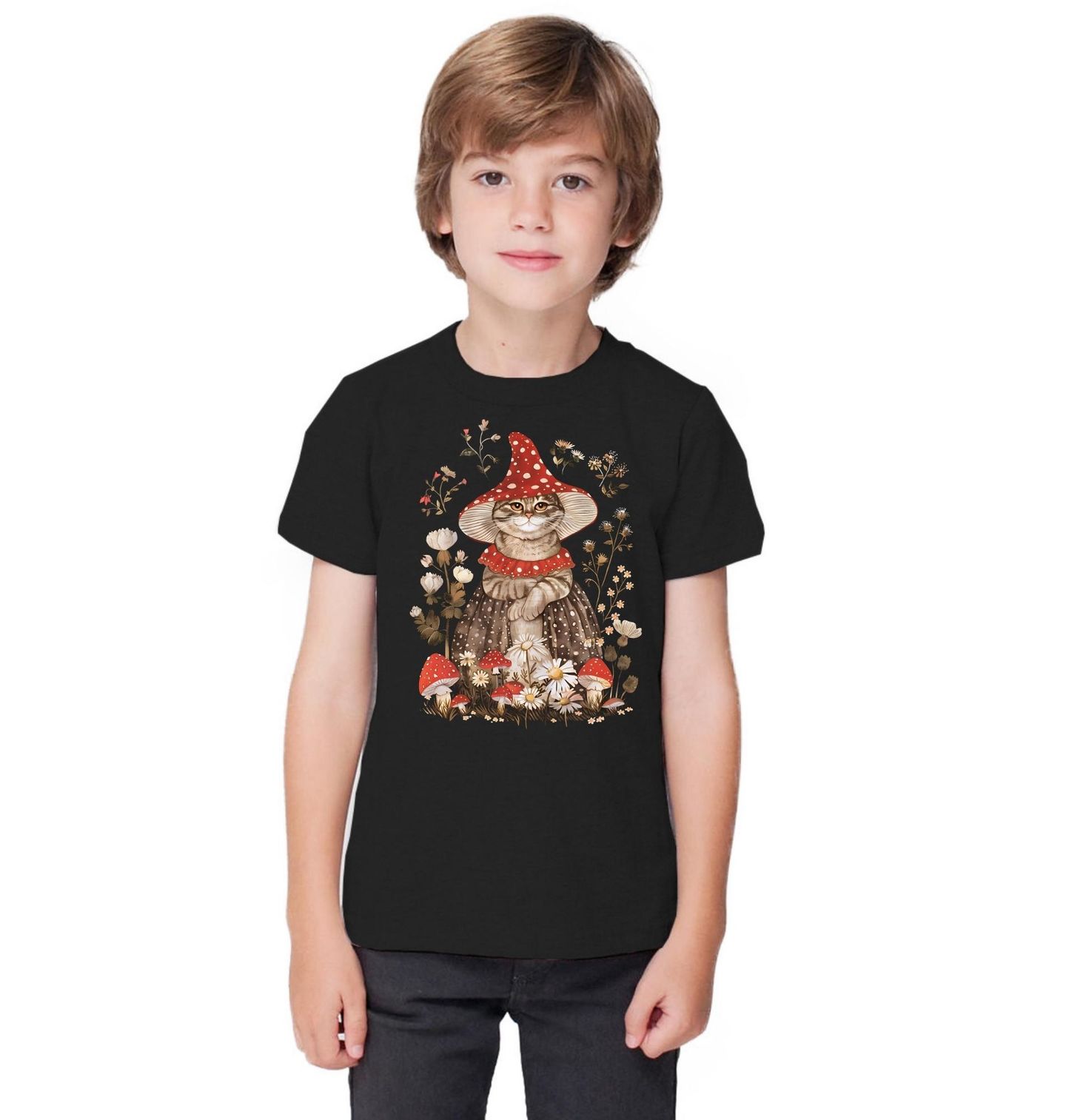 Dětské tričko Kočičí Muchomůrka. Nádherný a pohádkový motiv přináší jemnou atmosféru lesa plného kouzel a fantazie. Ilustrace zobrazuje elegantní postavu, kterou je kočka oblečená do šatů inspirovaných přírodou, doplněná výrazným kloboukem ve tvaru, jaký má houba Muchomůrka.