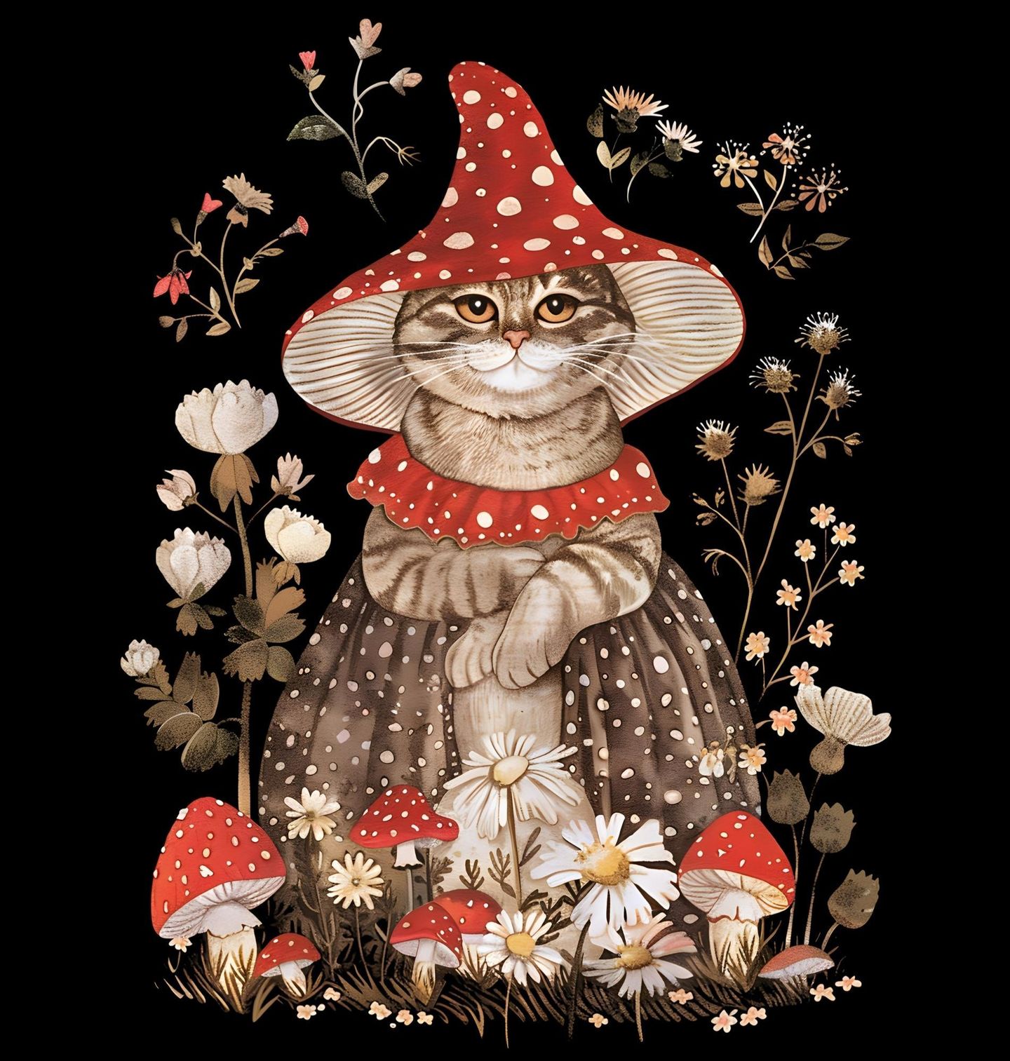 Pánská mikina Kočičí Muchomůrka. Nádherný a pohádkový motiv přináší jemnou atmosféru lesa plného kouzel a fantazie. Ilustrace zobrazuje elegantní postavu, kterou je kočka oblečená do šatů inspirovaných přírodou, doplněná výrazným kloboukem ve tvaru, jaký má houba Muchomůrka.
