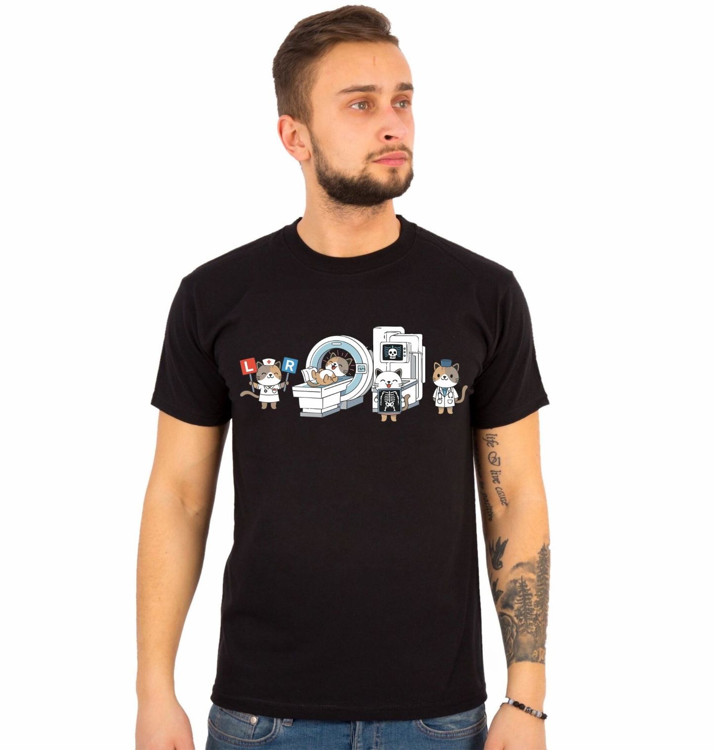 Pánské tričko Kočičí Rentgen. Kočka v tomto motivu přináší hravý pohled na zdravotnictví a ukazuje, že i lékařské prostředí může být zábavné. Detailní prvky jako rentgenové snímky, přístroje a zdravotnické doplňky dodávají designu autentický nádech. Ideální volba pro všechny, kdo pracují ve zdravotnictví, studují medicínu nebo mají rádi originální a vtipné motivy.